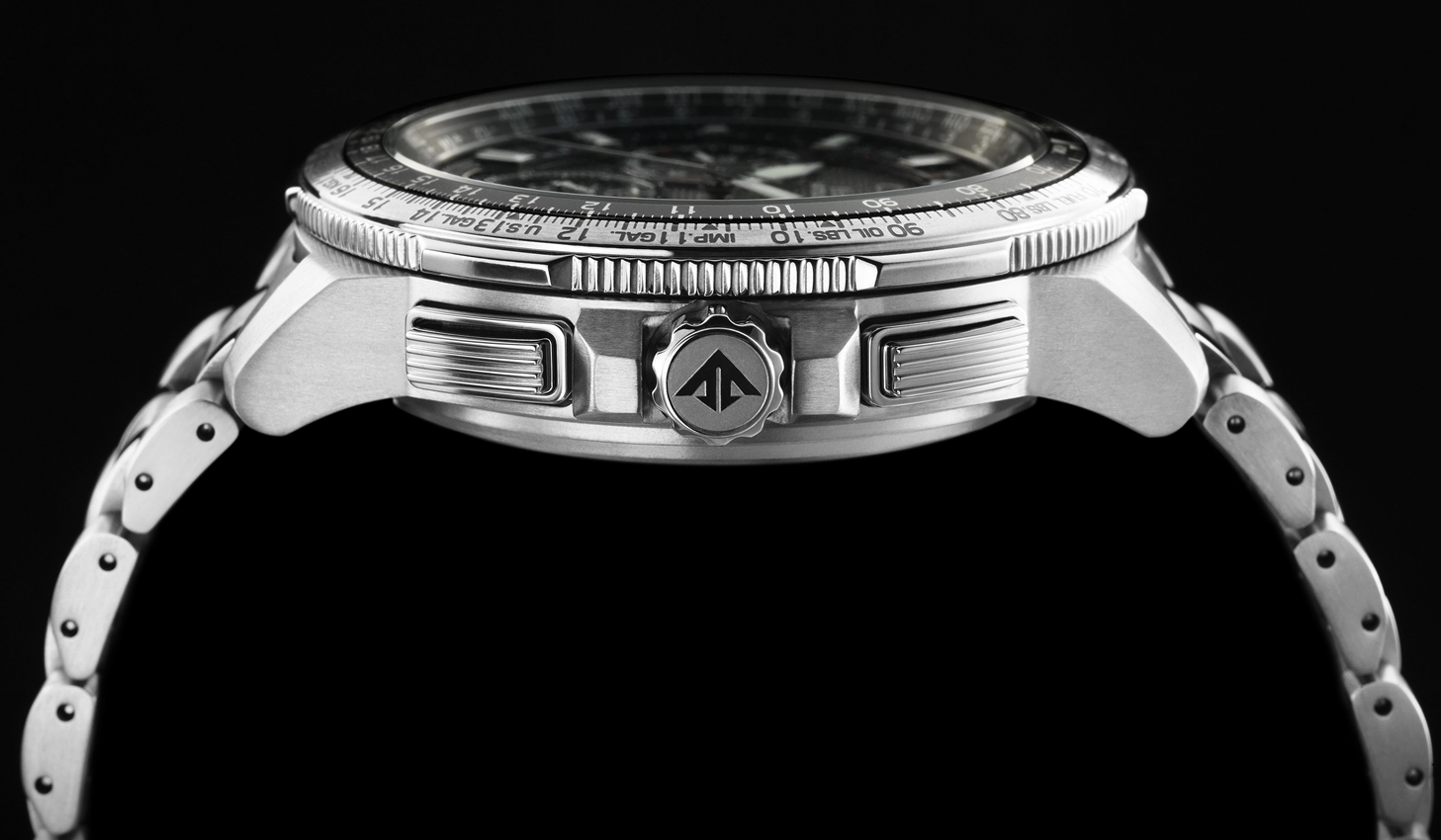 Wokół szafirowego szkła, którym przykryta jest tarcza, porusza się obrotowy pierścień, ze skalą suwaka logarytmicznego, dzięki któremu można dokonać obliczeń danych w najpopularniejszych jednostkach prędkości, wagi czy też pojemności.