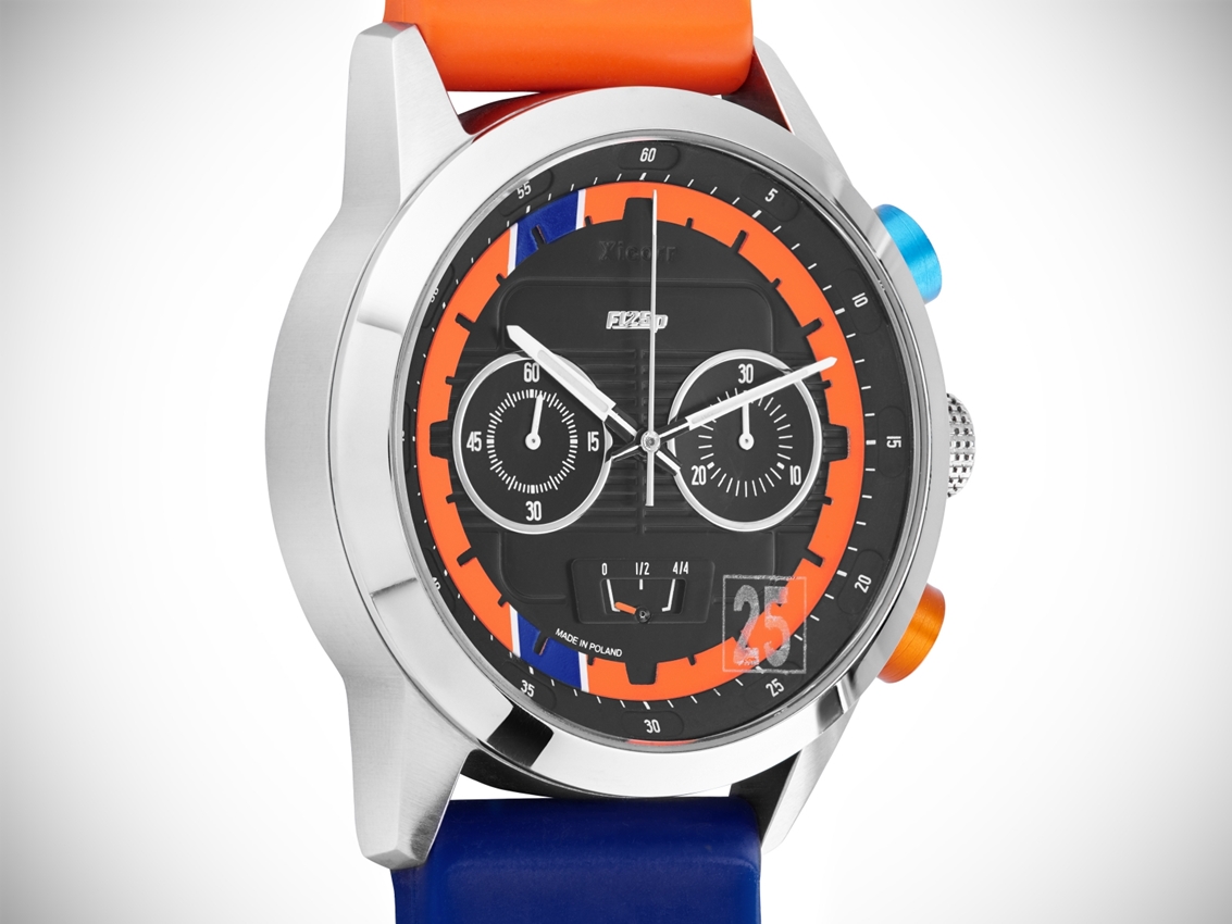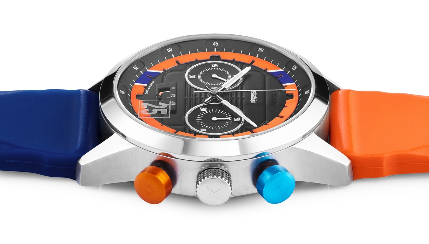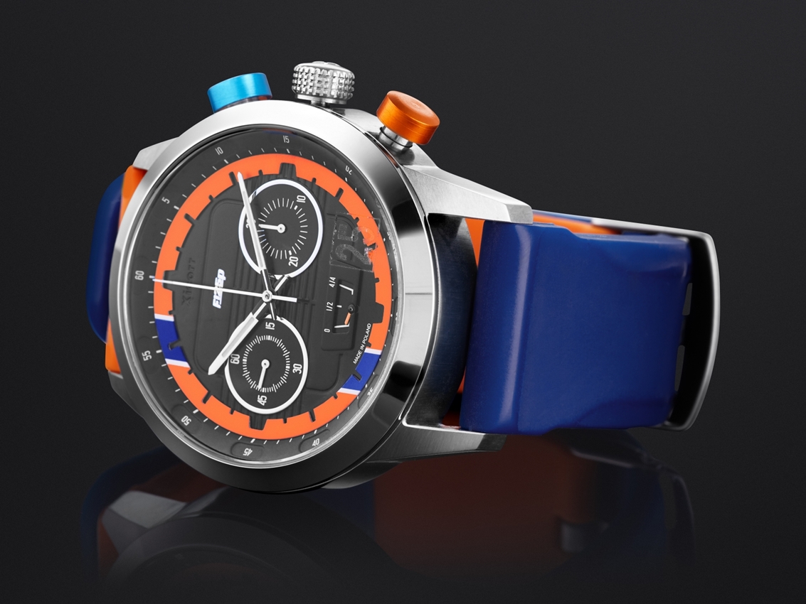 Górny, odpowiadający za startowanie i zatrzymywanie jest niebieski, a dolny służący do resetowania jest pomarańczowy. Ciekawostką jest dwukolorowy pasek, to znaczy cześć górna z klamerką jest pomarańczowa, a dolna niebieska. Ostatnim „kolorowym” akcentem jest pomarańczowa wskazówka rezerwy chodu.