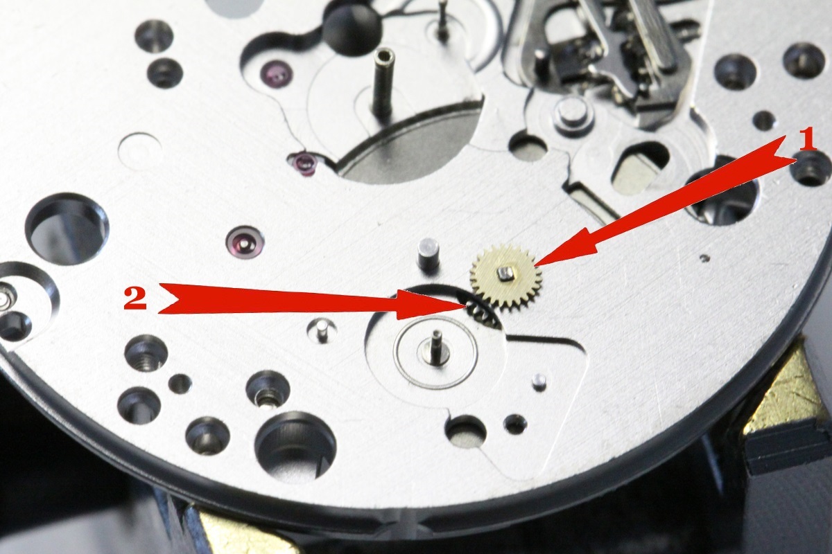 Zębnik (na rysunku poniżej wskazany strzałkami) jako element wyjściowy z dyferencjału napędza koło zębata z osadzoną na nim wskazówką rezerwy chodu.
