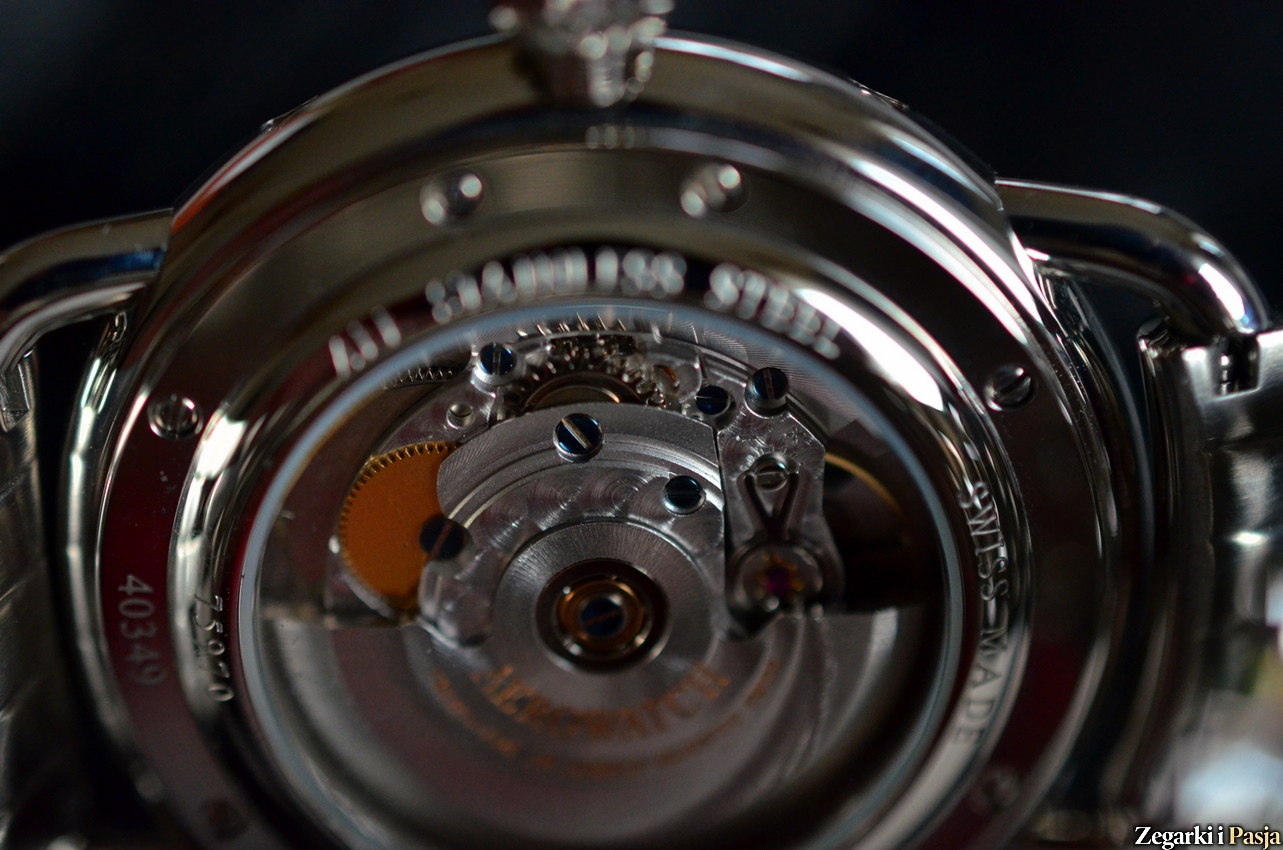 Poniżej widać elementy z perełkowaniem oraz z wykończeniami przypominającymi lekko zagięte szlify słoneczne, a widoczne śrubki są zabarwione na niebiesko. Daje to całkiem atrakcyjny widok, tym bardziej, że mechanizm bazowy jest w standardzie Top Grade – czyli najwyższym.