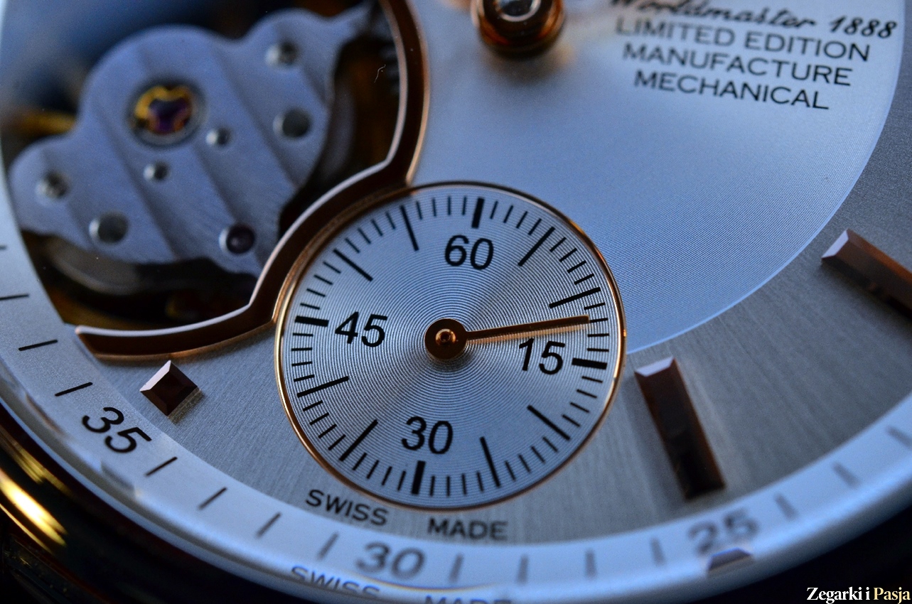Na godzinie 6-tej umiejscowiona jest lekko zagłębiona tarcza małego sekundnika.