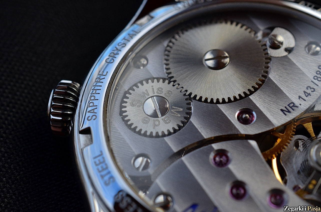Oglądając prezentowane czasomierze od strony dekla, dzięki dużemu przeszkleniu widzimy doskonale tę stronę zastosowanego mechanizmu zegarka, którego bazę stanowi Unitas 6497. Ceniony i lubiany mechanizm z ręcznym naciągiem sprężyny, słynie z niezawodności i doskonałych parametrów użytkowych.