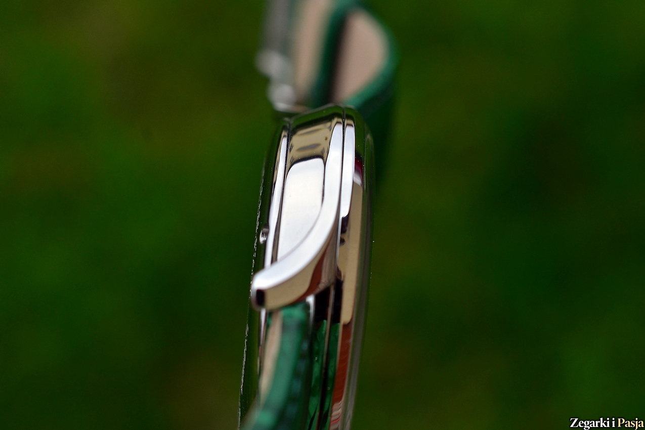 Koperta jest w całości polerowana. Kiedy patrzymy na nią od strony tarczy wydaje się być taka, jak opisywałem wyżej: klasyczna, stonowana, spokojna. Okazuje się jednak, że pozwolono sobie na nieco fantazji i polotu, co ujawnia się, kiedy spoglądamy na zegarek z profilu.