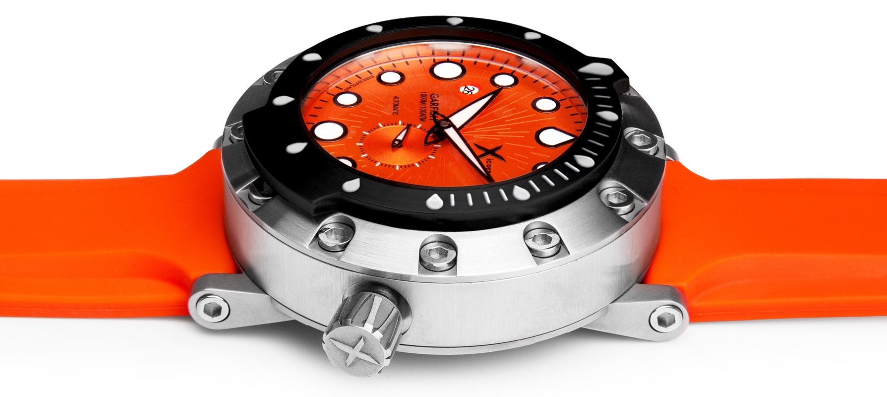 W Garfisch dochodzi obrotowy czarny element, pełniący funkcję lunety z wypustkami na górze i na dole dla łatwiejszego uchwycenia oraz operowania, poprawiający nurkową funkcjonalność zegarka. Czarny kolor to efekt zastosowania trwałej powłoki DLC. Naniesiono na nim indeksy co 5 minut, dodatkowo zaznaczając pierwsze dwadzieścia poprzez uzupełnienie znacznikami minutowymi.