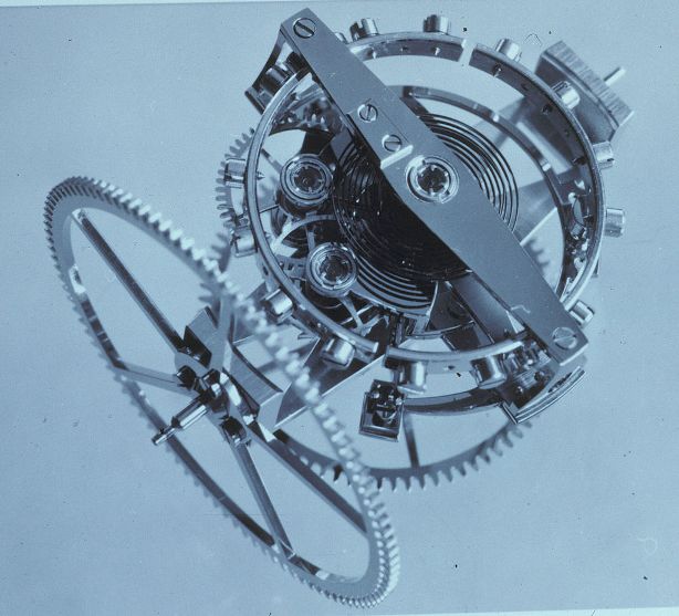 In 1977, the two-axis tourbillon was patented and installed in a portable clock by Anthony Randall, who inspired Thomas Prescher to develop smaller versions of two-axis tourbillon for pocket and wristwatches.