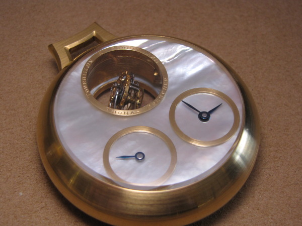 In 2003, the German watchmaker Thomas Prescher, inspired by the invention of Anthony Randall (two-axis tourbillon in a carriage clock - information below) developed for a pocket watch a two-axis flying tourbillon called gyrotourbillon, in which the second axis rotates parallel to the dial of the watch.
