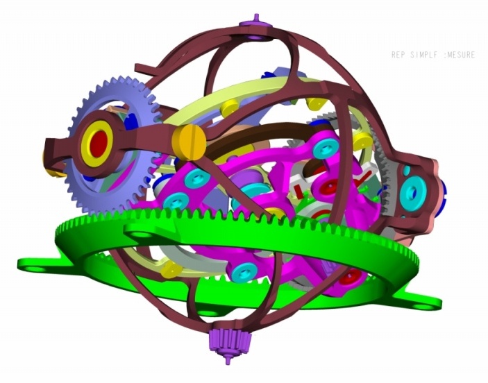The tourbillon was made of 90 titanium elements with a total weight of 0.336 grams. The gyrotourbillon has two cages that rotate in two surfaces. The gyrotourbillon protects six anti-shock systems.