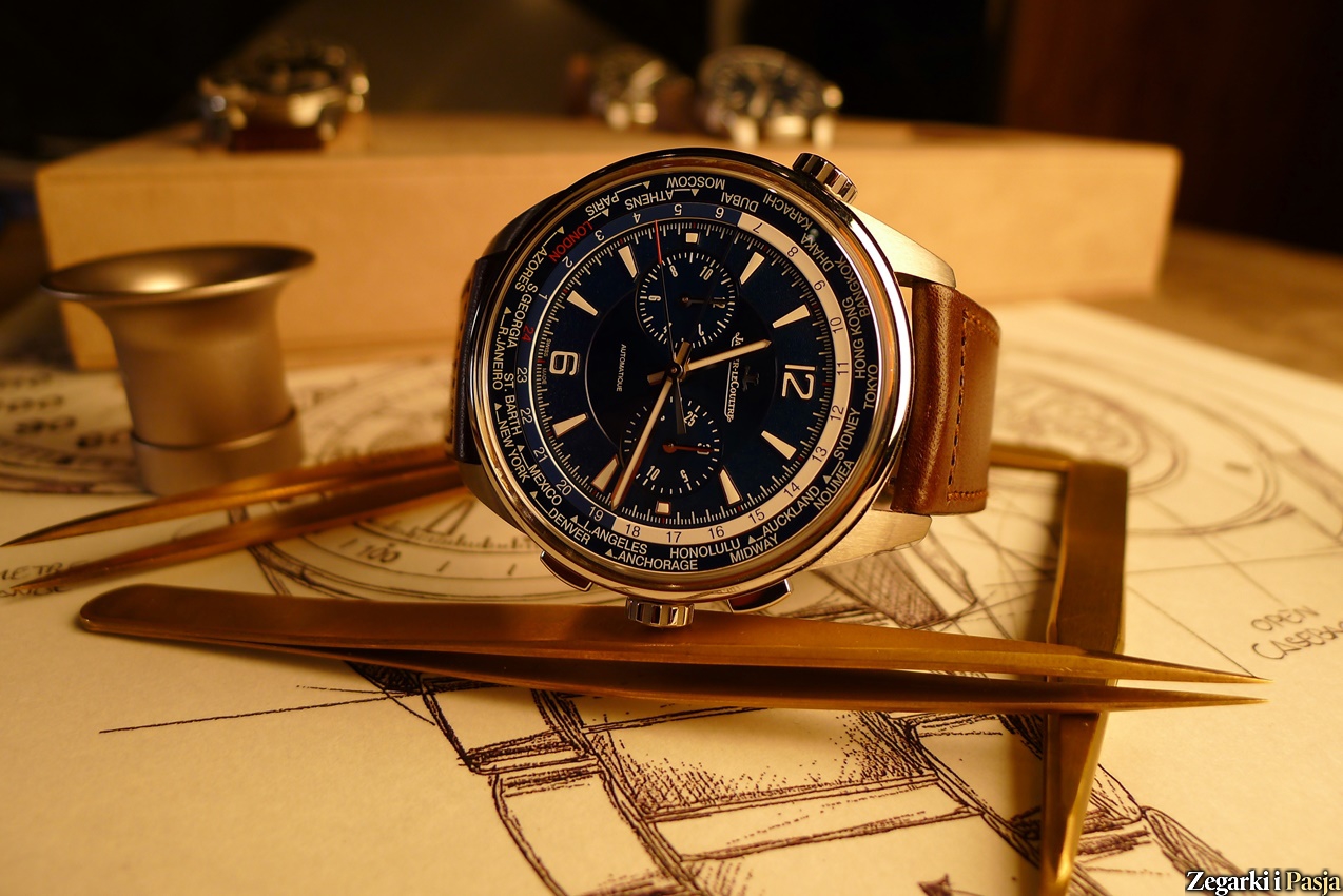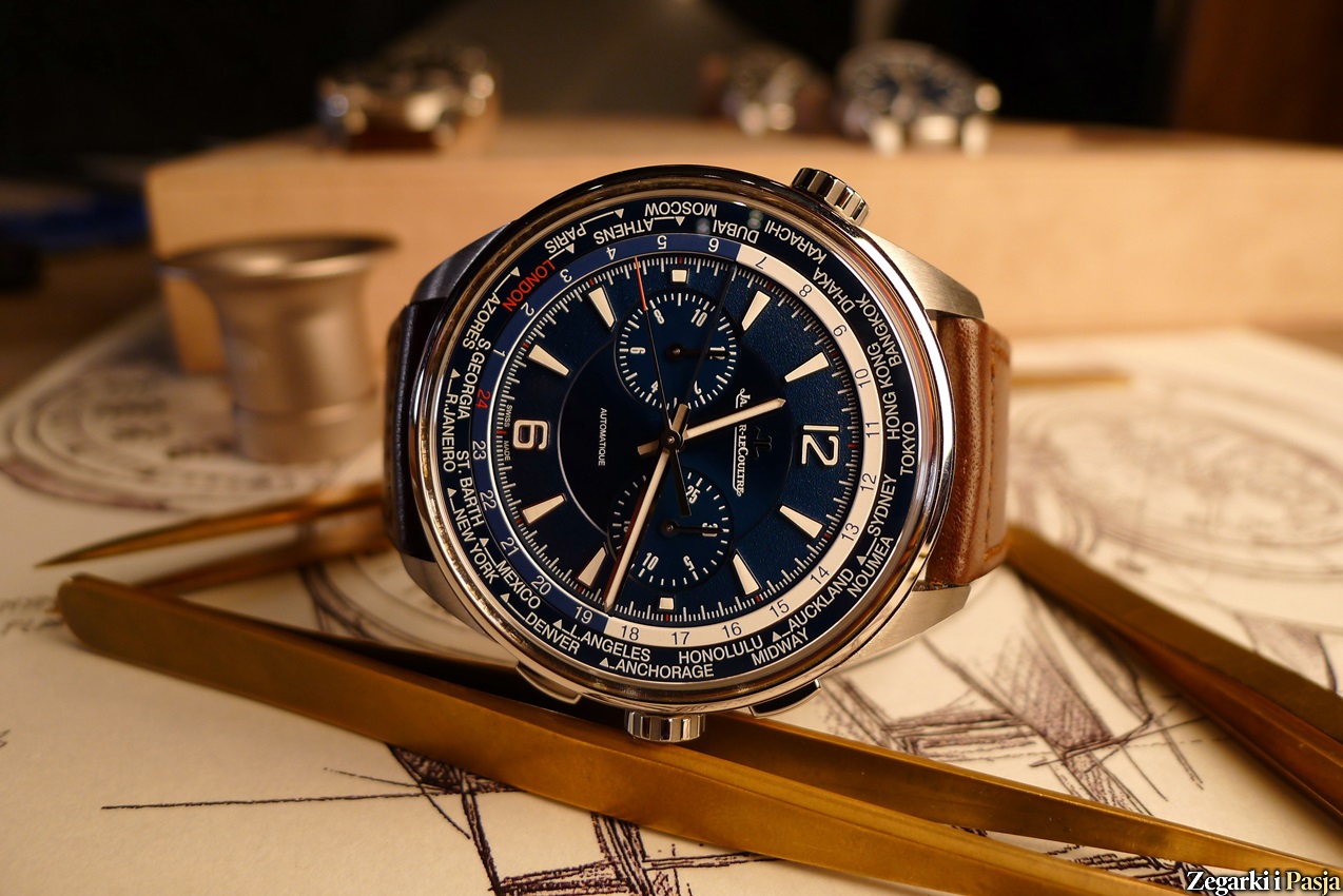Wersję J-LC Chronograph World Timer rozpoznać można po charakterystycznym podwójnym pierścieniu okalającym tarczę, który zastąpił oznaczenia tachometru.