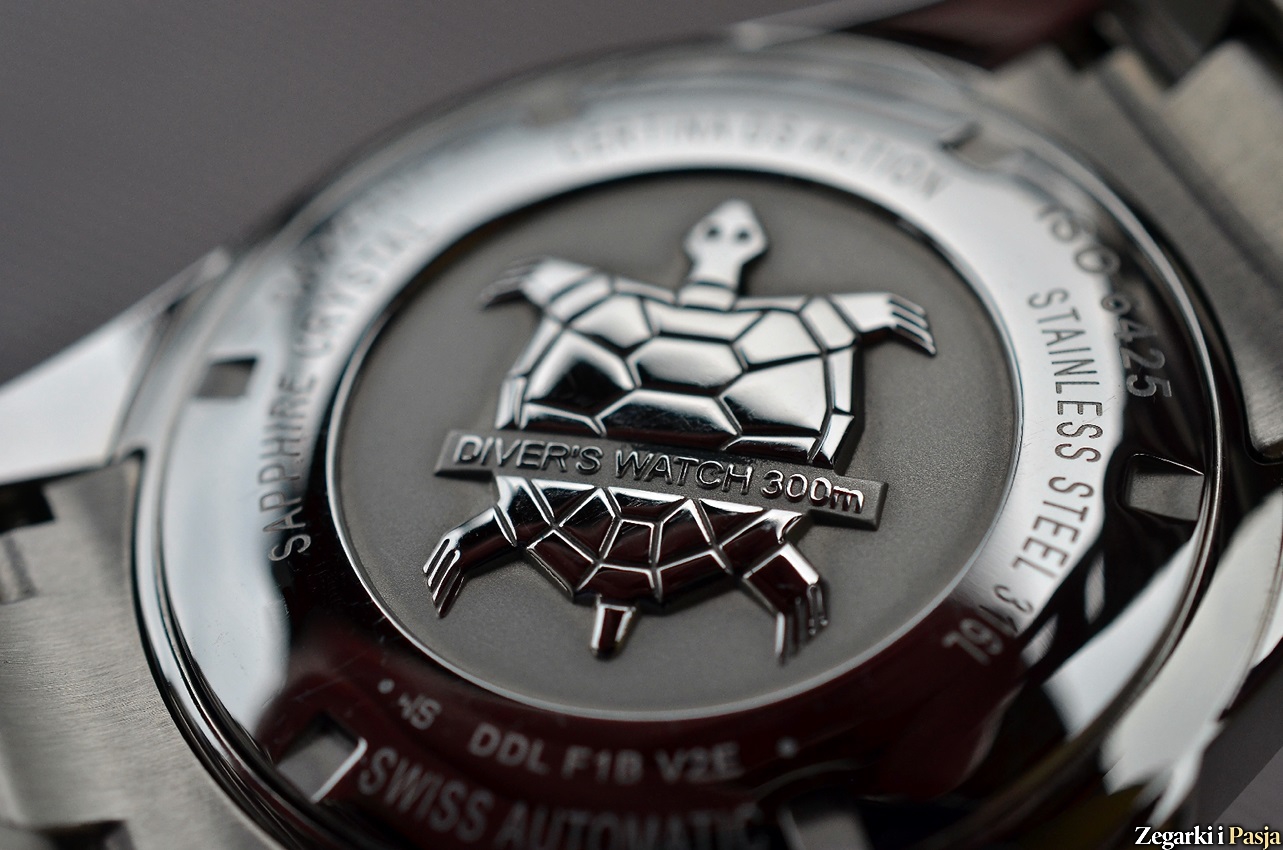 Koperta ma 43 mm średnicy, co w tego rodzaju zegarkach wydaje się być rozmiarem uniwersalnym. Natomiast 13,1 mm grubości to niewiele jak na tak odporny zegarek. 51 mm wysokości od ucha do ucha to także rozmiar szeroko akceptowalny. Tę zgrabną kopertę od góry wieńczy płaskie szkło szafirowe z powłoką antyrefleksyjną naniesioną od wewnątrz, a z drugiej strony od spodu zastosowano wkręcany pełny dekiel.