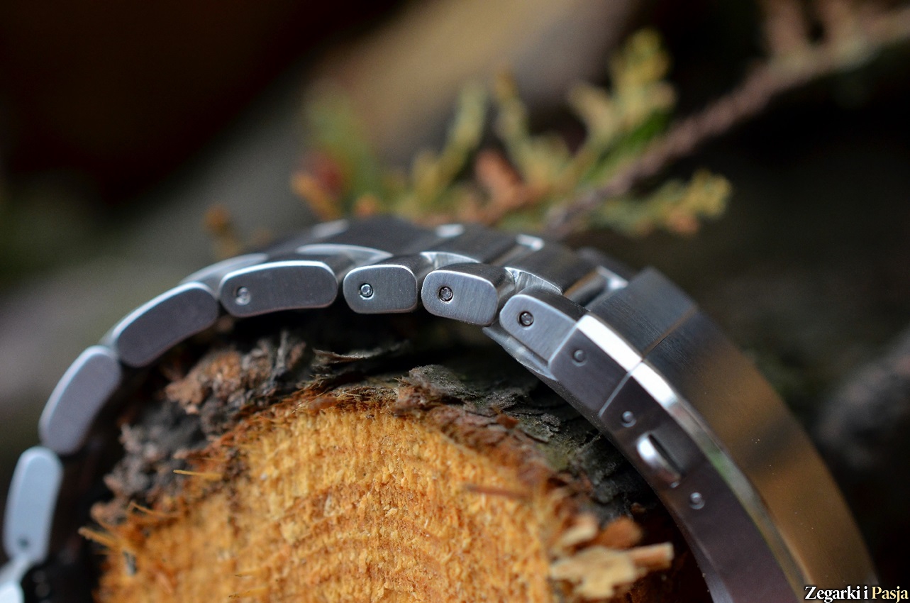 W zegarku do nurkowania integralną częścią i ważnym elementem zdaje się być sposób mocowania na nadgarstku. W testowanym modelu to solidna stalowa bransoleta wykonana z pełnych ogniw. Jest ona w całość szczotkowana. Przy mocowaniu do koperty zastosowano pełne, dobrze dopasowane i solidnie zakotwiczone maskownice.