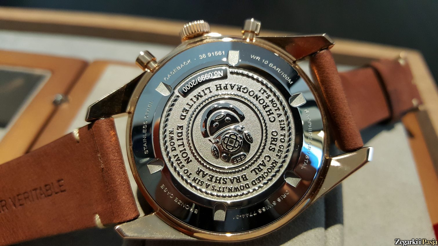 Klasyczny, estetycznie wykonany diver z kopertą wykonaną z brązu rozszerzał z sukcesem kolekcję Oris Divers Sixty-Five. Kolejna wersja ma nieco mniej czystą i prostą formę, ponieważ mechanizm został wyposażony w komplikację konstrukcji w postaci stopera. To można powiedzieć kolejny, wyższy poziom upamiętnienia niezwykłego człowieka, jakim był Carl Brashear.