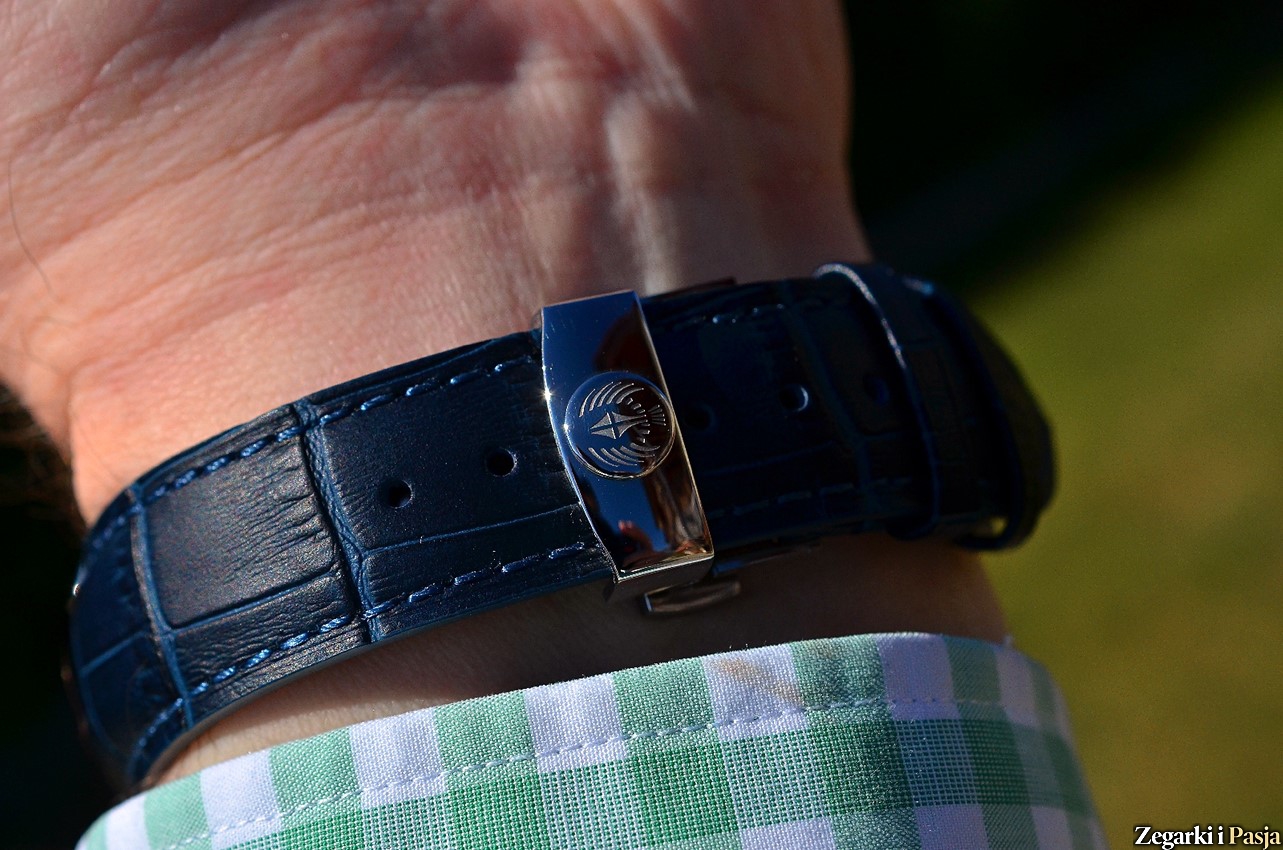 Zegarek otrzymujemy wraz ze skórzanym paskiem o fakturze skóry krokodyla, w kolorze współgrającym z tarczą (jest też wersja na stalowej bransolecie). Warto poświęcić nieco uwagi i zatrzymać się przy klamrze. To element, po którym widać podejście firmy do szczegółów. Klamra to wprawdzie standardowy „motylek”, ale na ramionach, nie widocznych i nie oglądanych przecież gdy jest zapięta, wygrawerowano nazwę firmy i logo.