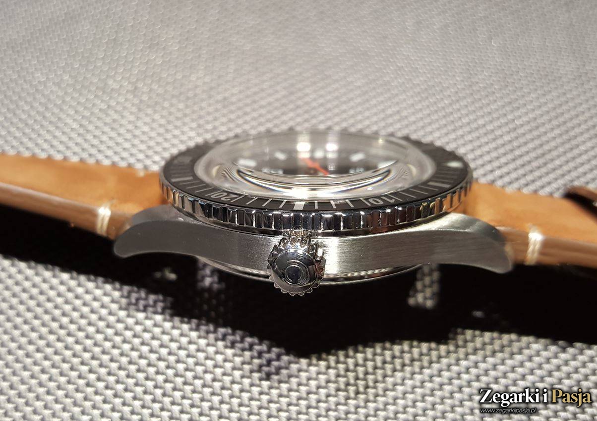 Koperta zegarka w kształcie nie różni się od starej wersji. Tak samo, posiada okrągły kształt z wyraźnymi podłużnymi uszami. Powierzchnie zostały wyszczotkowane, dzięki czemu zachowuje on swój unikalny styl vintage. Patrząc jednak na ten model od strony cyferblatu można odnieść wrażenie, że płaszczyzna tarczy jest zbyt zdominowana przez szeroką obręcz obrotowego pierścienia. Odczucie to jednak moim zdaniem jest nieuzasadnione, bowiem zarówno obrotowy pierścień i cyferblat doskonale współgrają ze sobą dzięki masywnym podziałkom naniesionym na oba elementy. Luneta posiada 60 minutową skalę nurkową.