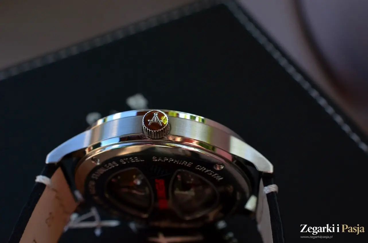 Ostatni element układanki w stylu retro to wskazówki. Godzinowa i minutowa to wyraziste ramiona zakończone na wzór stalówki pióra, choć podobny typ wskazówek określany jest jako „sword”, czyli w kształcie miecza. Wskazówki te są wypełnione masą luminescencyjną w białym kolorze, która świeci na zielono. Niezbyt mocno, intensywnie, ale wystarczająco długo. Wskazówki zapewniają czytelność i pasują do całokształtu doskonale, stając się jednocześnie wyróżniającym elementem projektu, ponieważ każdy z modeli tej dość bogatej rodziny został wyposażony we wskazówki w tym kształcie. Ostatnia wskazówka to sekundnik, który jest wąski i długi. Sięga do podziałki minutowej i polakierowano go na czerwony kolor, co komponuje się z nadrukowaną nazwą modelu, a wraz z nią stanowi ożywiający, kontrastowy akcent.