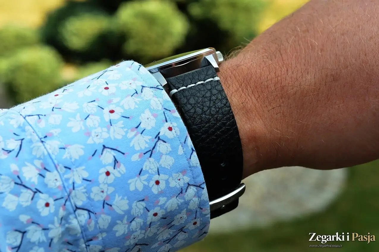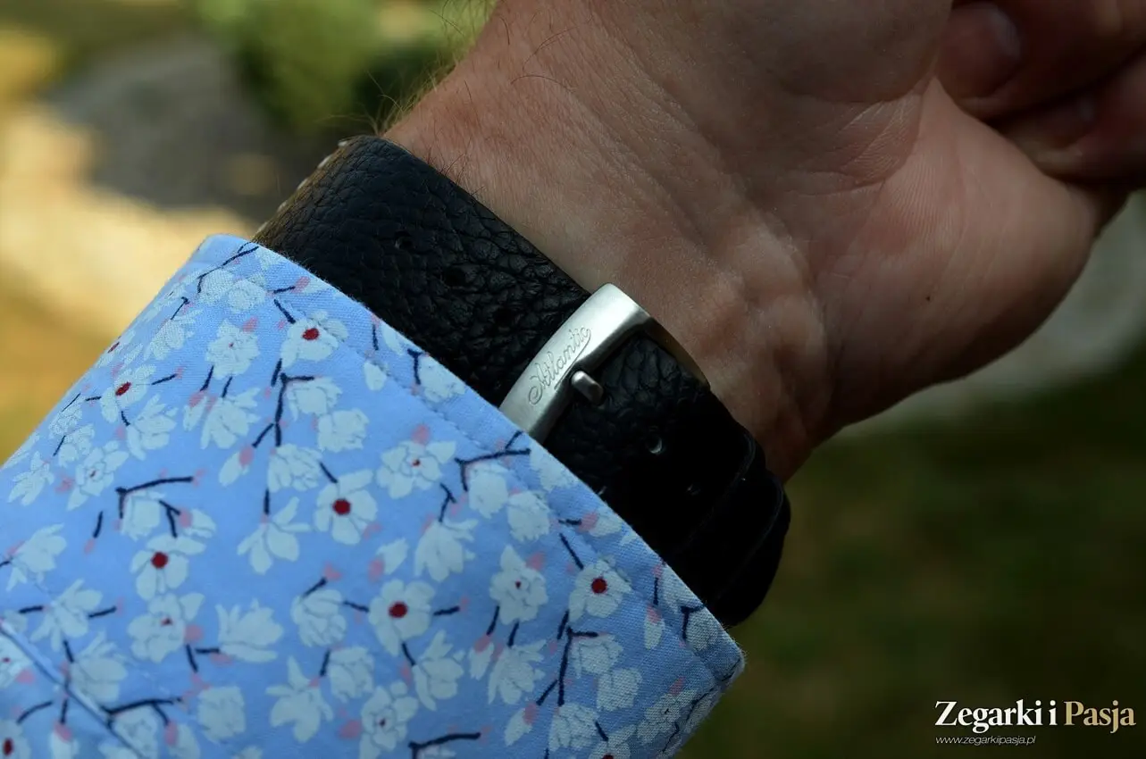 Pasek wykonany ze skóry, w czarnym kolorze, ma bardzo ciekawą fakturę od wewnętrznej strony. Sposób szycia wzorowany jest na paskach vintage. Część od wewnątrz, futrówka, wykonana jest z delikatnego, niebarwionego nubuku. Najważniejsze jest jednak to, że pasek doskonale pasuje do całości, ale także od samego początku świetnie się układa na nadgarstku, ponieważ jest miękki i elastyczny.