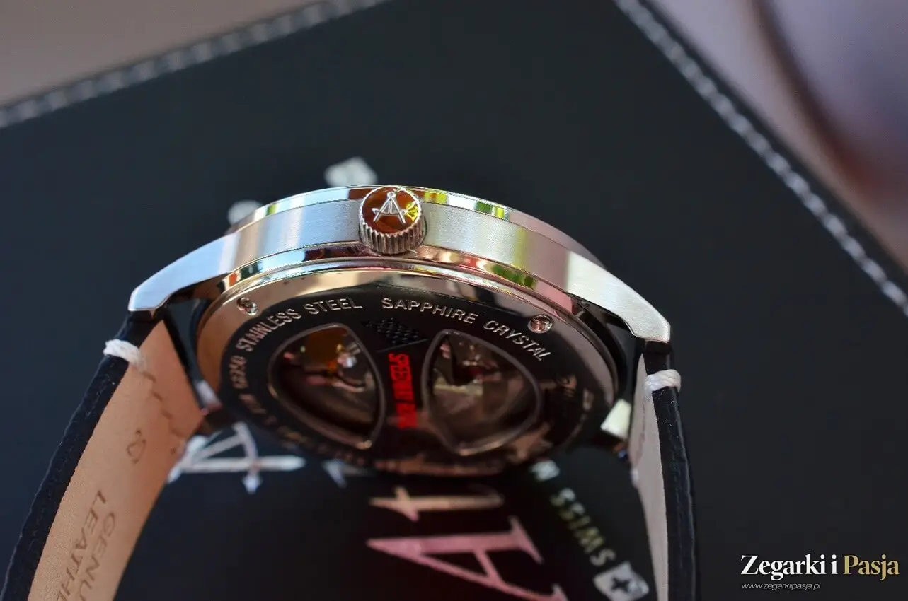 Wspomniany mechanizm to znana i ceniona jednostka „napędowa”, nazywana często wołem roboczym - Eta 2824-2. Łożyskowany na 25 kamieniach i pracujący z częstotliwością oscylacji balansu wynoszącą 28 800 wahnięć na godzinę mechanizm uchodzi za bezawaryjny i trwały. Chwalony jest także za wysoką precyzję chodu, dość łatwą regulację, a w razie konieczności atutem jest niezbyt kosztowny serwis. To także mechanizm, który jest relatywnie płaski, co pozwoliło na uzyskanie całkowitej grubości koperty na poziomie 11,4 mm, mimo nieco wypukłego szkła. Rozmiar 49,5 mm od ucha do ucha to nie mało. Jednak przyjęło się, że do 50 mm w tym pomiarze traktowane jest także jako wielkość uniwersalna, dobrze „akceptowana” przez większość nadgarstków.