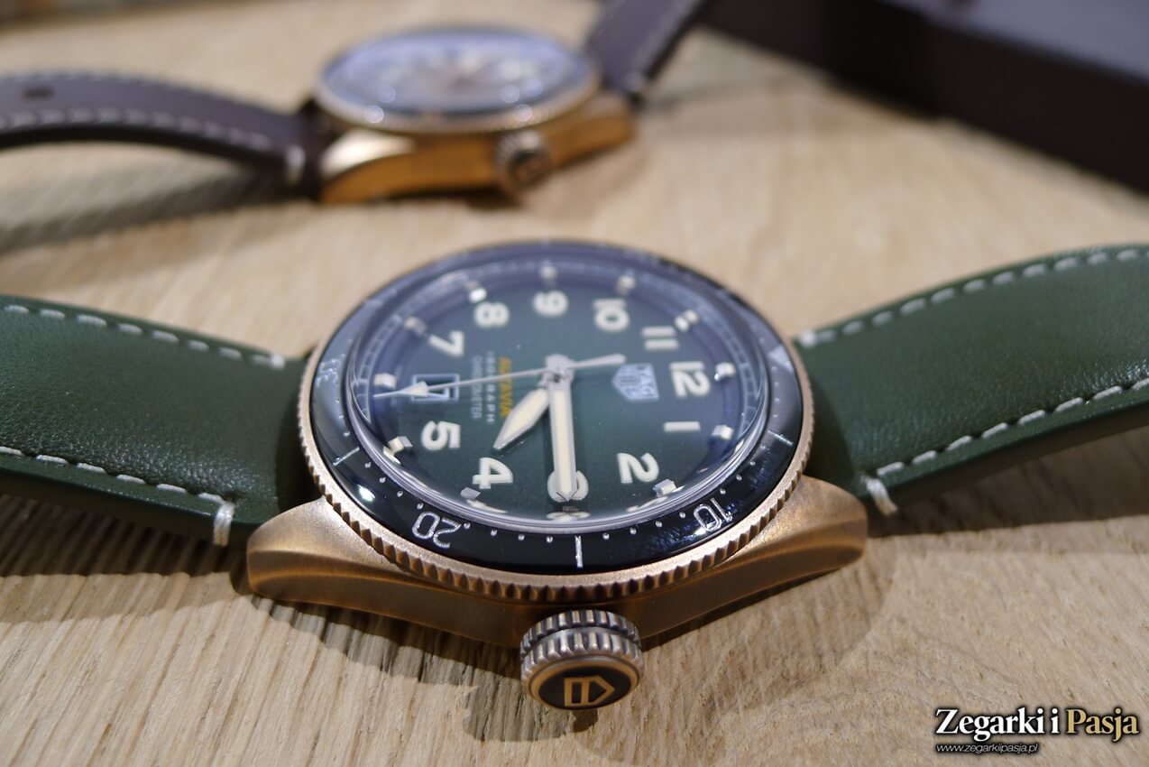 Autavia Isograph Chronometer Bronze ma dekiel wykonany z tytanu.