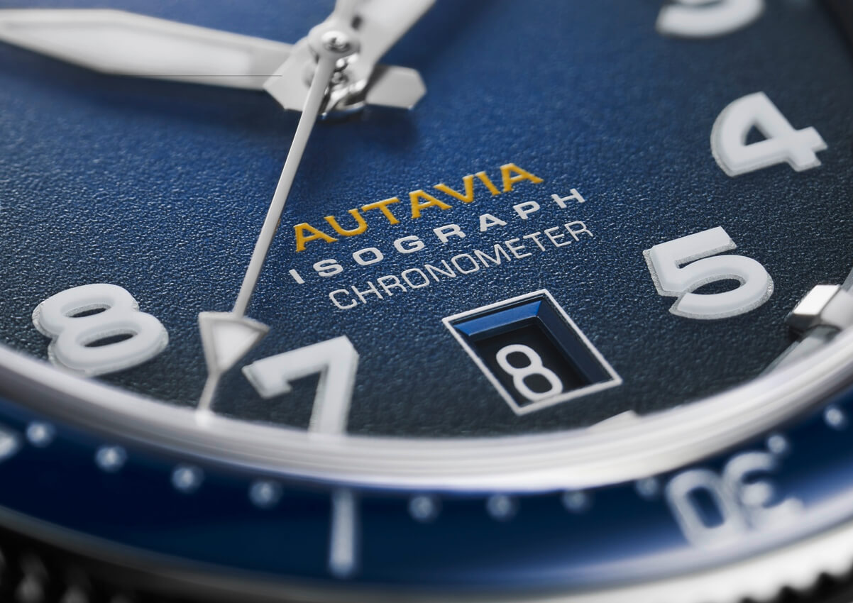 Gradientowa powierzchnia tarczy występuje w kolorze czarnym, szarym lub niebieskim i ma atrakcyjną dla oka ziarnistą strukturę. Na godzinie 6-tej umieszczono okienko datownika wskazujące dzień miesiąca na czarnym tle. Pod godziną 12-tą widzimy logo firmy, a po drugiej stronie nazwę linii, czyli Autavia oraz napisy ISOGPAPH i CHRONOMETER. Ten ostatni napis świadczy o tym, że mamy do czynienia z doskonale wyregulowanymi zegarkami, ale o tym napiszę w dalszej części artykułu.