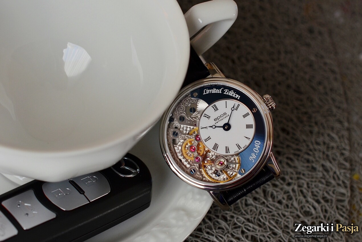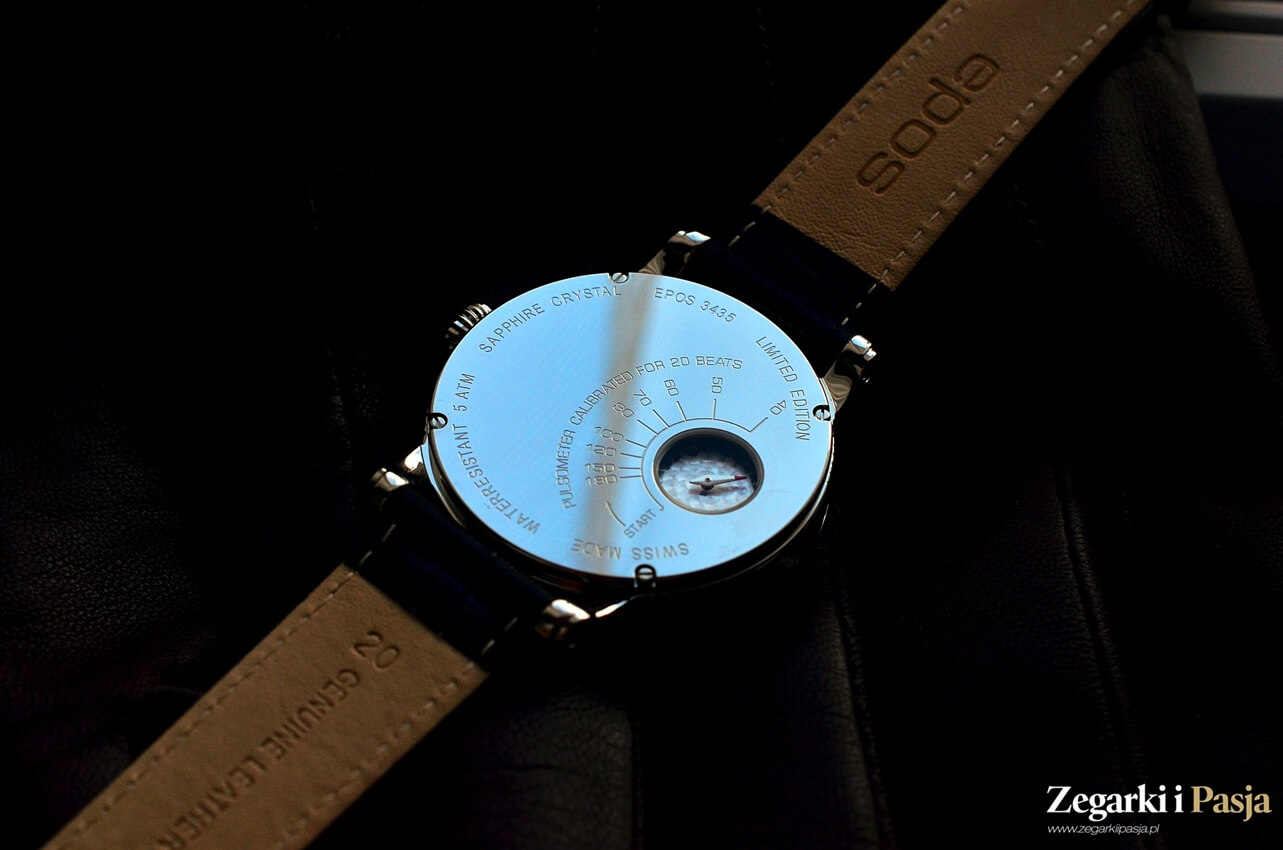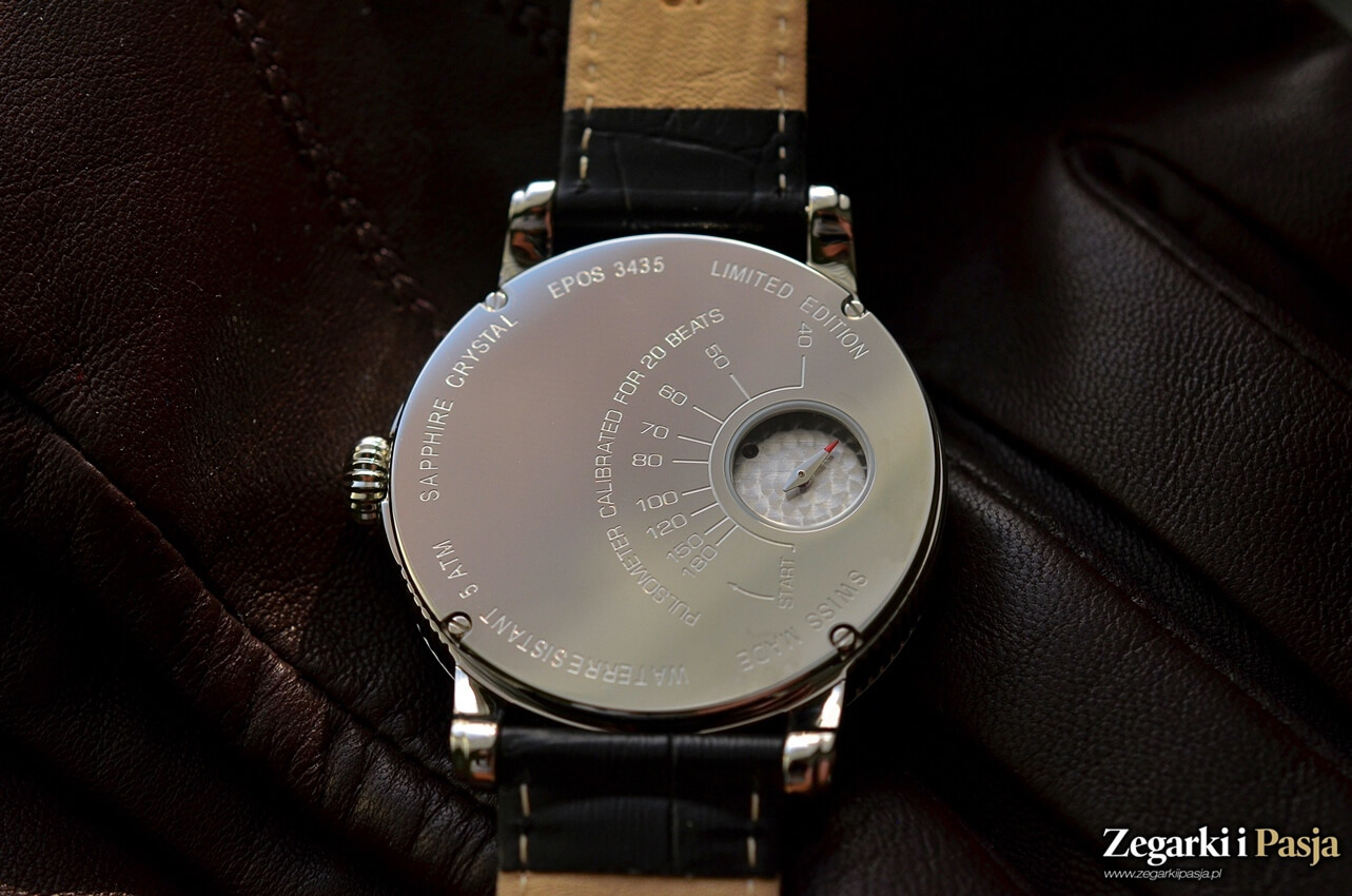 Ale wróćmy do prezentowanego modelu - EPOS Oeuvre D'Art 3435 Verso 2. Verso w pierwszym wydaniu był ciekawą wizją, świeżym powiewem innowacji w branży. Prezentacja czasu na spodzie mechanizmu, odwrócenie go i potraktowanie tego, co widzimy zwykle przez przeszklony dekiel jako część frontową zegarka, było odważnym i bardzo efektownym posunięciem. Tak samo nieustannie zaskakuje sekundnik w małym okienku na deklu zegarka, pełniący funkcję pulsometru, co zostało także zastosowane w wersji 2.
