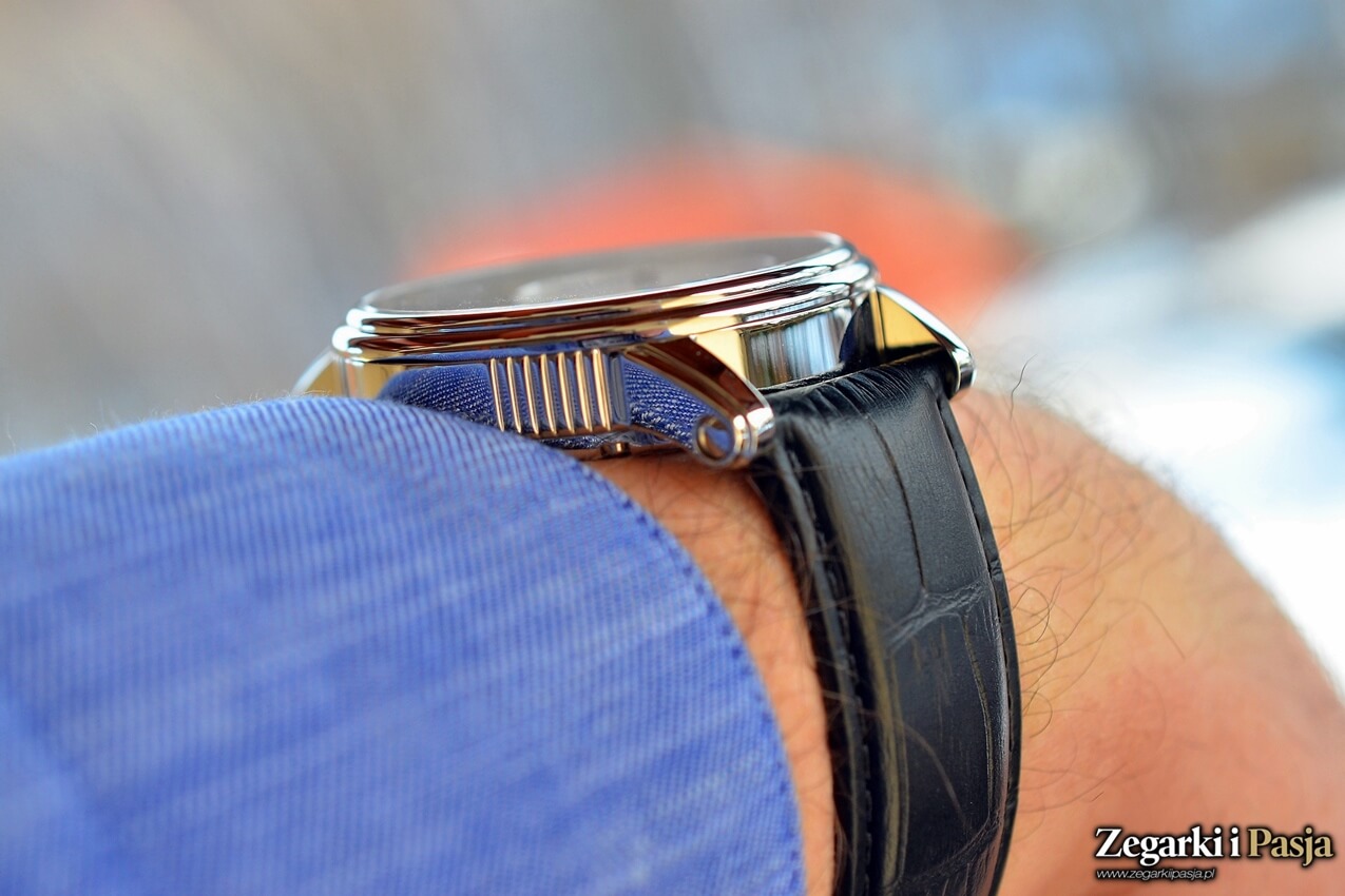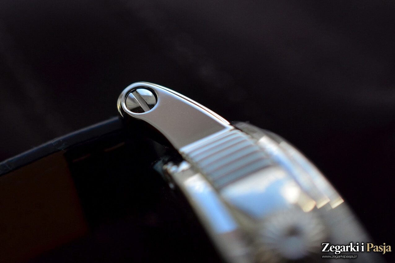 By komponowały się z lunetą także na nich zastosowano zabieg stylistyczny w postaci uskoku, na bocznych zewnętrznych krawędziach. Zaokrąglone zakończenie jest miejscem mocowania paska, który przytwierdzamy do koperty za pomocą śrubek w każdym z otworów w uszach. Główki tych śrub są zaoblone i polerowane na wysoki połysk. Od każdego ucha w kierunku środka boku zegarka odchodzi powierzchnia przyozdobiona jakby użebrowaniem poprowadzonym pionowo. Pomiędzy nimi mamy gładką polerowaną powierzchnię, a po prawej stronie wygospodarowano miejsce na wygodną, cebulkowatą koronkę uzupełniającą w udany sposób klasyczną koncepcję tego zegarka.
