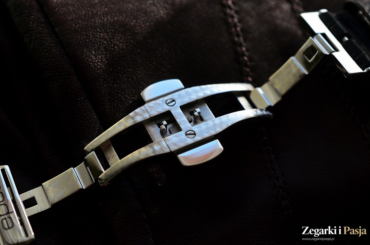 Po zapięciu klamry widzimy tylko niewielki element z wygrawerowanym i wypełnionym na czarno logo marki. Jednak po rozłożeniu jej widać, że każdy z solidnie wykonanych elementów klamry został dokładnie wypolerowany, a widoczne płaszczyzny pokryto szlifem w postaci perełkowania.