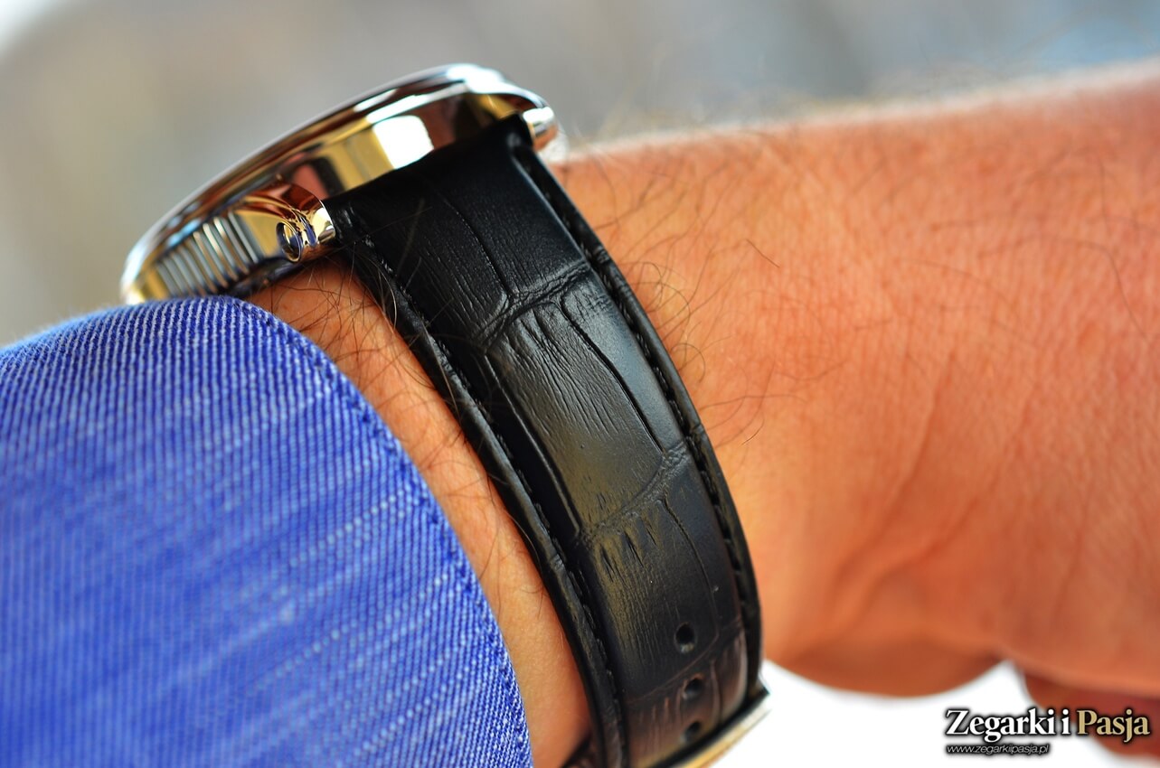Wodoodporność zapewniono na poziomie 50 metrów, co wydaje się być poziom wystarczający dla tego typu zegarka. Między uszami mieści się pasek wykonany ze skóry naturalnej o szerokości 20 mm. Do naszego egzemplarza dobrano go w czarnym kolorze. Nie jest przesadnie sztywny i dość szubko dostosowuje się do przegubu użytkownika.