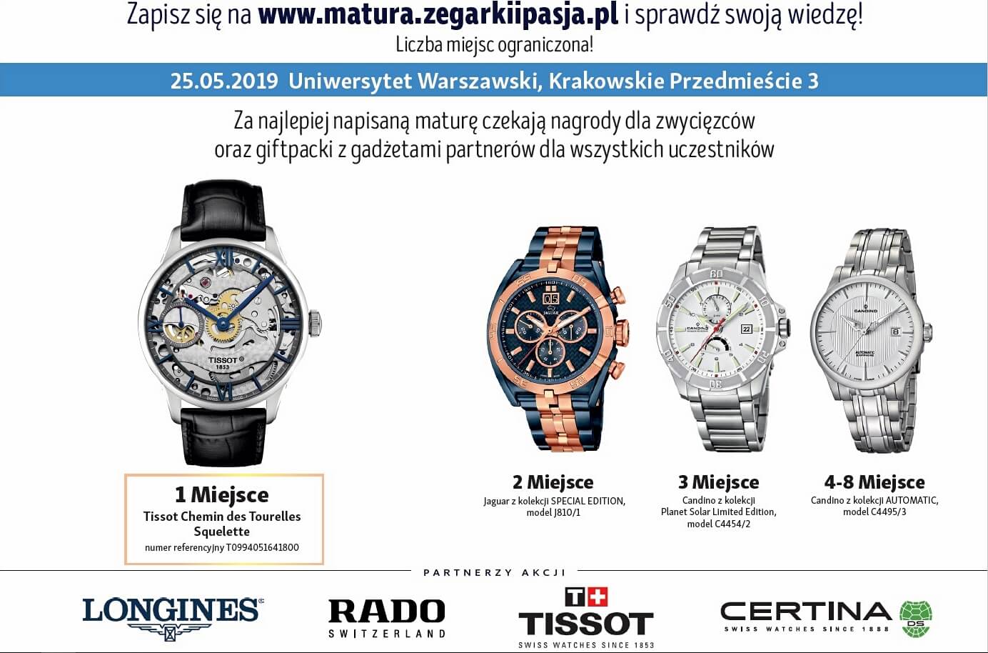 Za najlepiej napisany egzamin maturalny z wiedzy o zegarkach przewidujemy nagrody główne w postaci zegarków, a dla wszystkich uczestników Partnerzy akcji ufundują „start packi” z gadżetami.