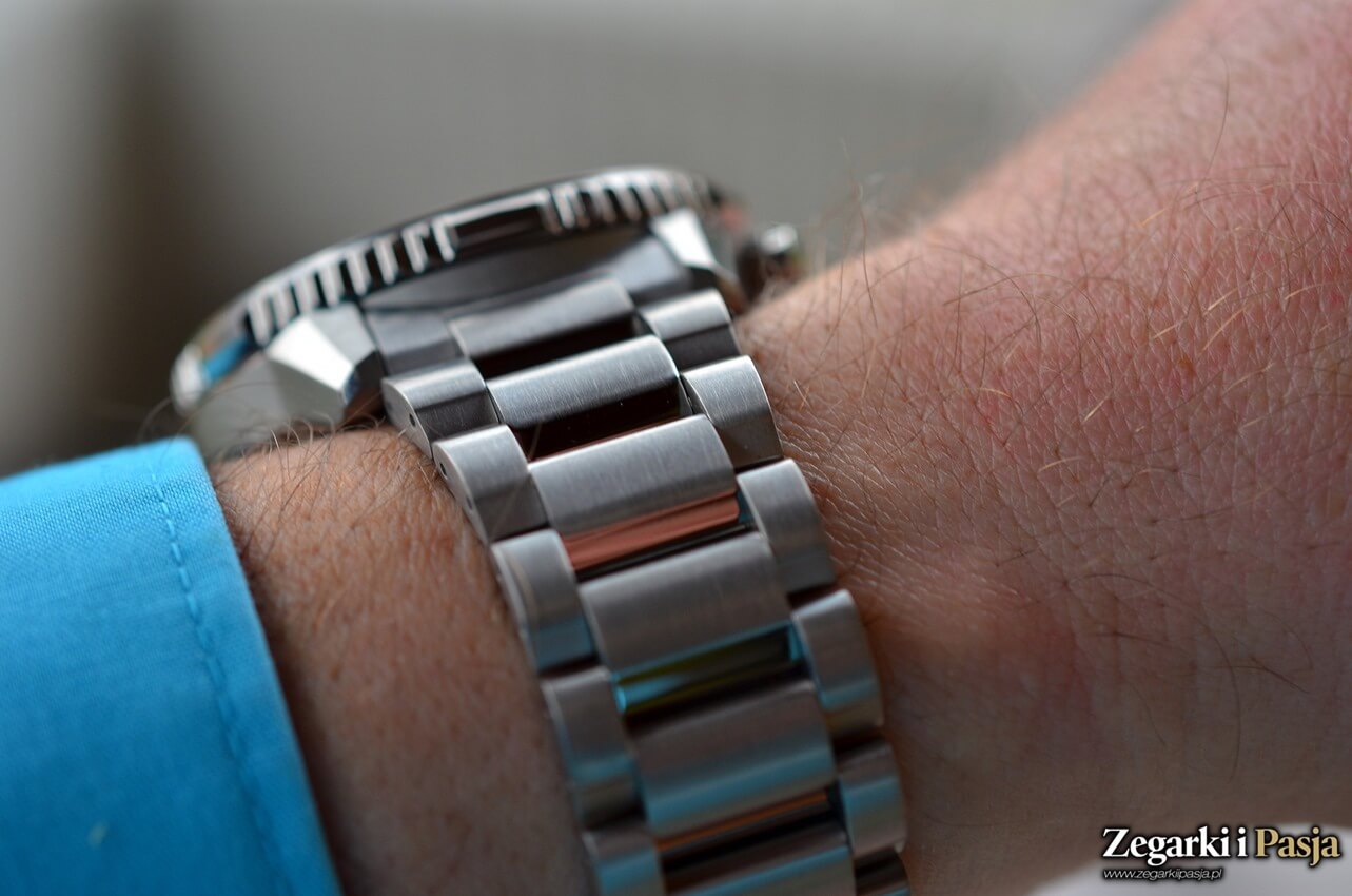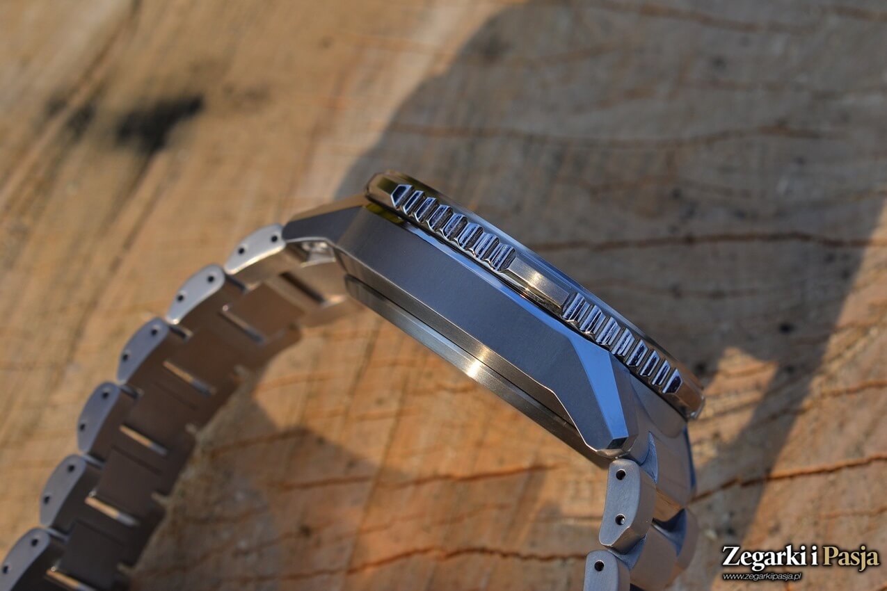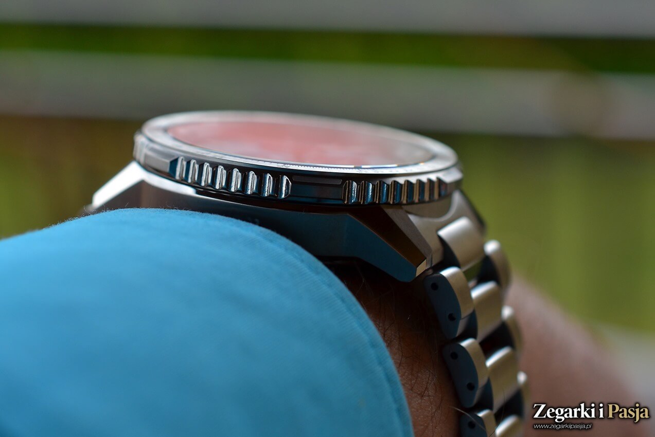 Prócz materiału z jakiego została wykonana, koperta jest także ergonomicznie ukształtowana. Nieco ponad 14 mm grubości sprawia, że obudowa wygląda proporcjonalnie i nie odstaje zbytnio od nadgarstka. Należy jednak stale pamiętać o sporym wymiarze koperty, trzeba mieć to na uwadze, gdyż w pewnym momencie, przy węższym nadgarstku zegarek może stać się najzwyczajniej zbyt duży. To nie zegarek dla każdego, choć przymierzany przez mojego znajomego, którego nadgarstek ma 17 centymetrów obwodu prezentował się nadal dobrze, dając nawet pewien „zapas” nawet na przegub o jeszcze mniejszym obwodzie.
