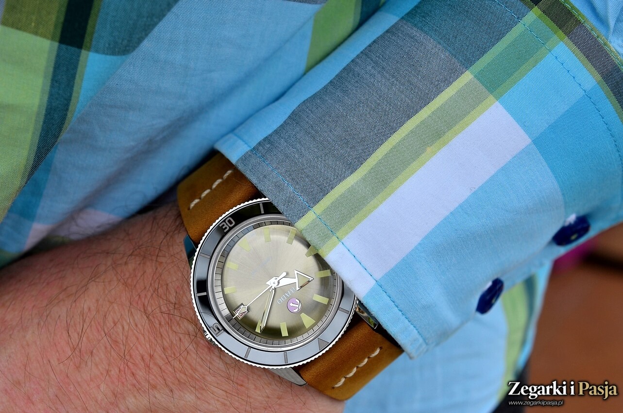 Chodzi o to, że jest w kolorze trudnym do nazwania przez przeciętnego faceta. Zadania nie ułatwia zastosowany szlif słoneczny, który powoduje ekscytującą grę świateł na powierzchni cyferblatu, i zmianę odcieni kolorów z oliwkowego na zielonkawy. A może jasnobrązowy?