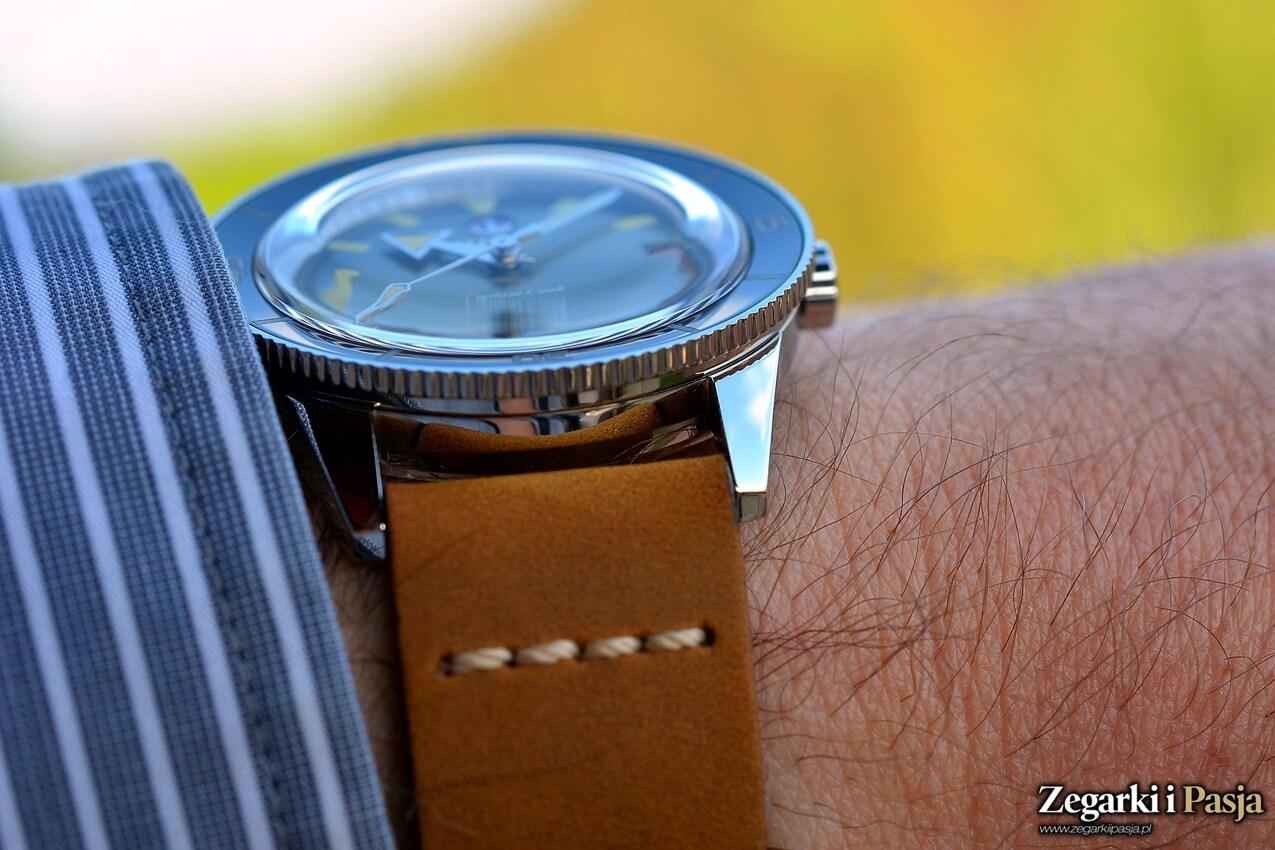 Być może byłoby to widoczne w bezpośrednim zestawieniu z hesalitem, ale wszystko wydaje się być w porządku, a samo zagięcie daje bardzo fajne zniekształcenia obrazu brzegów tarczy, co dodaje kilka punktów wizerunkowi retro całości. Tarczę i szkło okala luneta, która też jest jedną z cech charakterystycznych projektu i jedną z największych atrakcji tego zegarka.