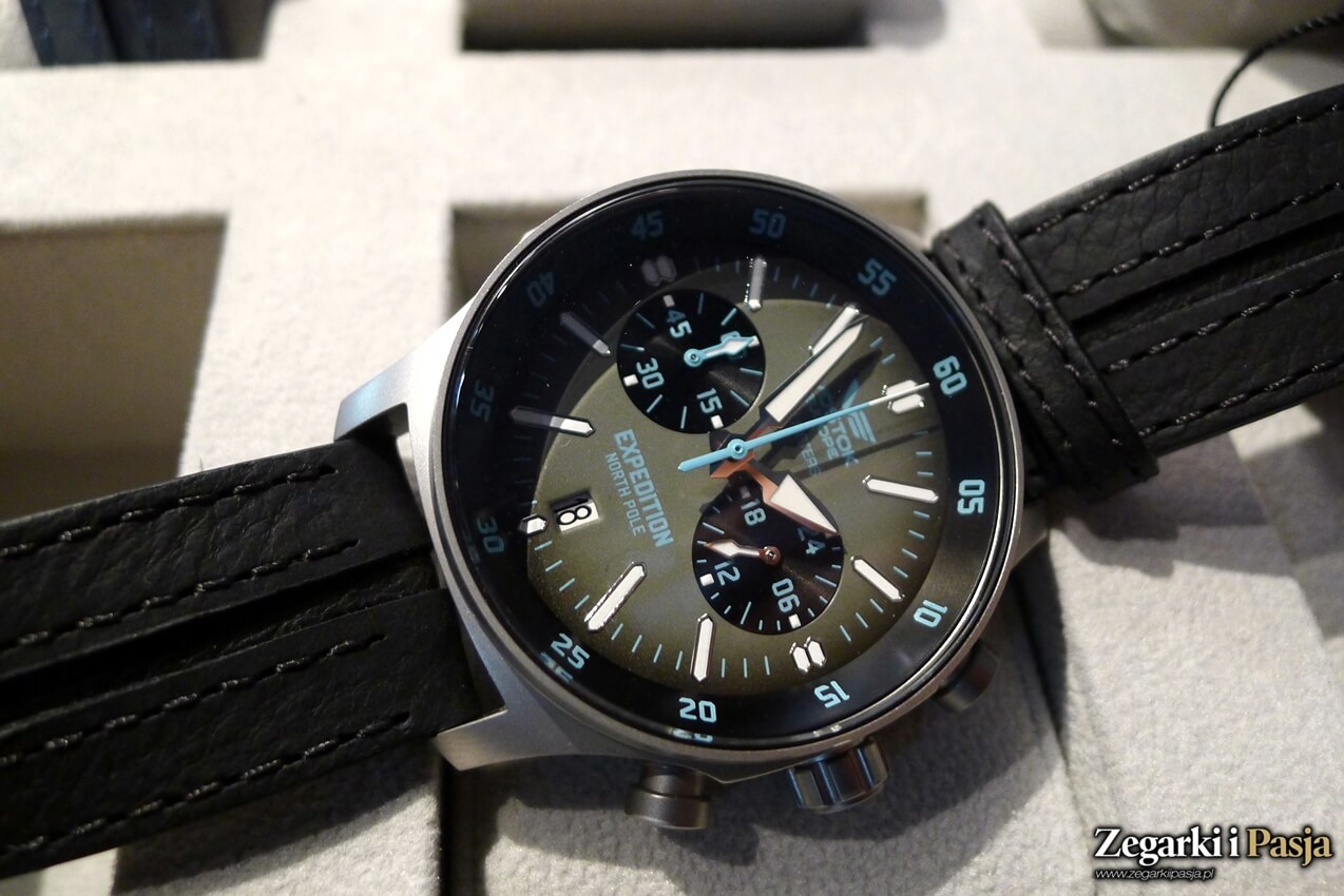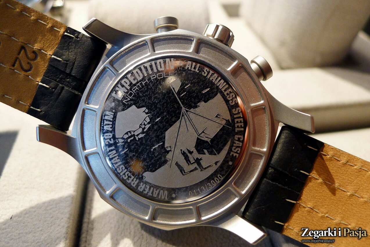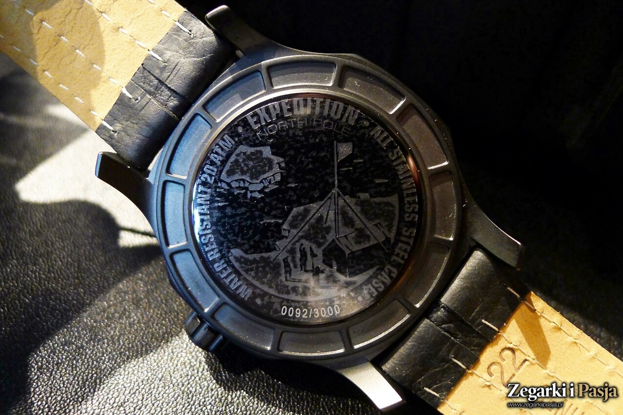 Dostępna jest jeszcze wersja Expedition North Pole Chronograph w kopercie pokrytej czarną powłoką PVD. W tym wariancie tarcza jest gradientowa, masa luminescencyjna beżowa, a logo marki oraz grot wskazówki sekundowej stopera w kolorze czerwonym.
