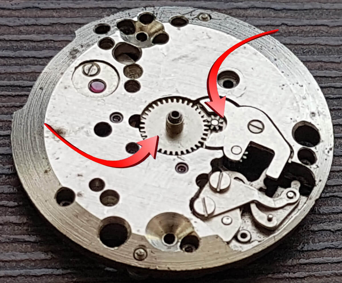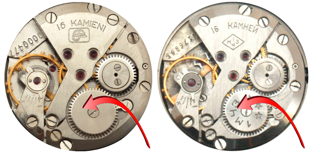 Wyraźnie rzucającą się w oczy i powszechnie znaną różnicą mechanizmu polskiego w stosunku do radzieckiego jest koło płaskie przekładni naciągowej. Stalowe koło nad bębnem napędowym nie posiada rzucających się oczy oznaczeń moskiewskiego producenta i ma fazowaną, zębatą krawędź.