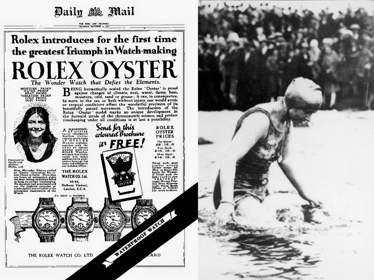 Za sukcesem marki stała jej technologiczna innowacyjność i znakomite pomysły marketingowe. Nawet doskonale brzmiąca nazwa nie sprzeda się sama. Potrzebna jest dobra reklama, którą budują celne pomysły. Oyster narodził się w 1926 roku, a już rok później stało się o nim głośno, gdy brytyjska pływaczka Mercedes Gleitze jako pierwsza Angielka przepłynęła kanał La Manche. Oyster był pierwszym wodoodpornym zegarkiem na świecie i wraz z nią pokonał Kanał w ciągu 10 godzinnego maratonu. Wyszedł z tej próby bez szwanku.