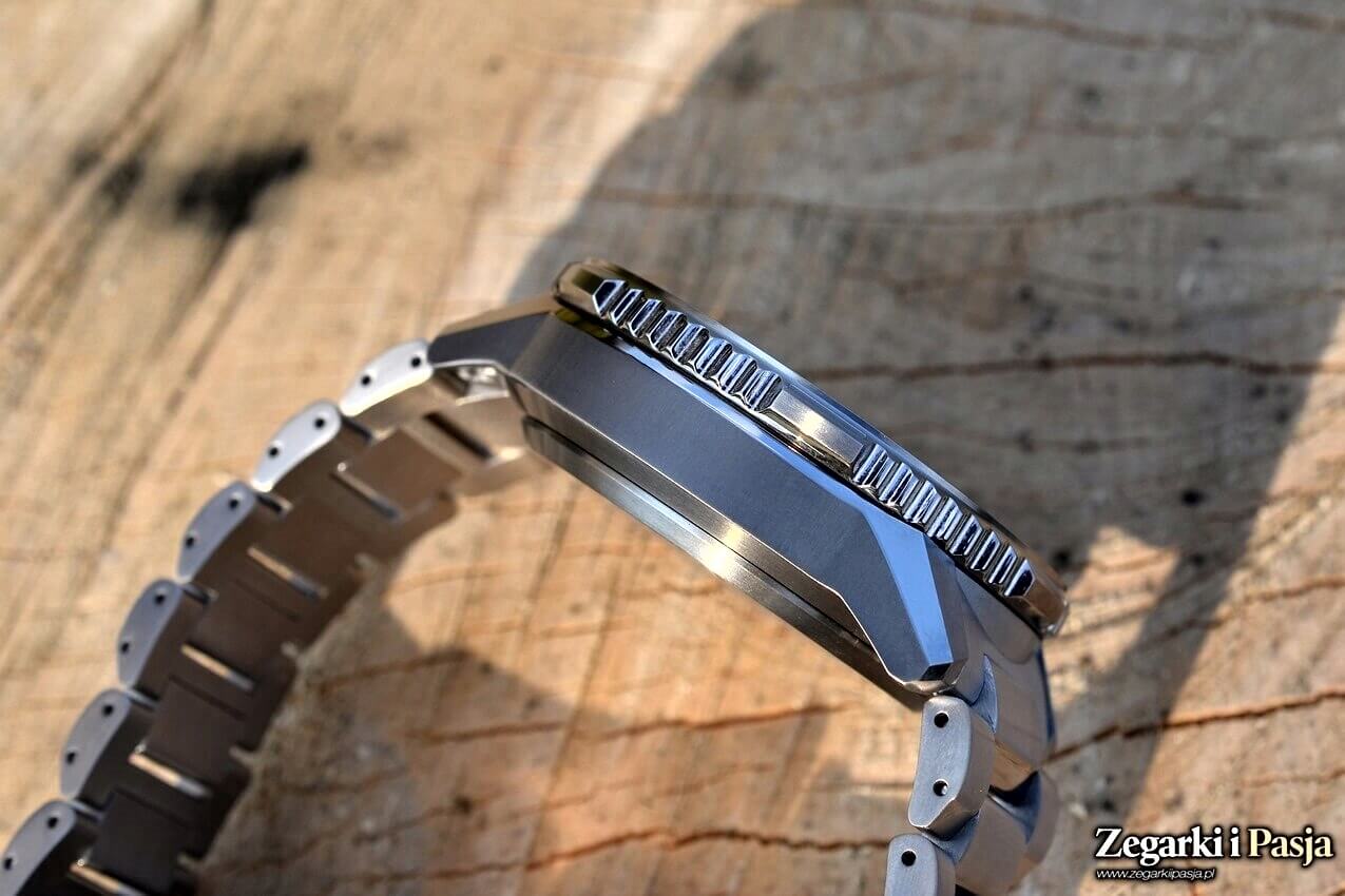 Zegarek posiadał kopertę w srebrzystym kolorze z doskonale obrobionymi - szczotkowanymi i lustrzanymi powierzchniami. Tak wysokiej jakości wykończenia nie powstydziłyby się firmy produkujące bardzo drogie zegarki wykonane ze stali szlachetnej, czy z drogocennych kruszców.