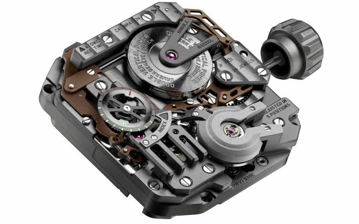 Wyposażony w najcieńszy mechanizm automatyczny z komplikacją chronografu i wskazaniem drugiej strefy czasowej o grubości zaledwie 3,3 mm. Łączna grubość koperty tego wyjątkowego modelu wynosi 6,9 mm.