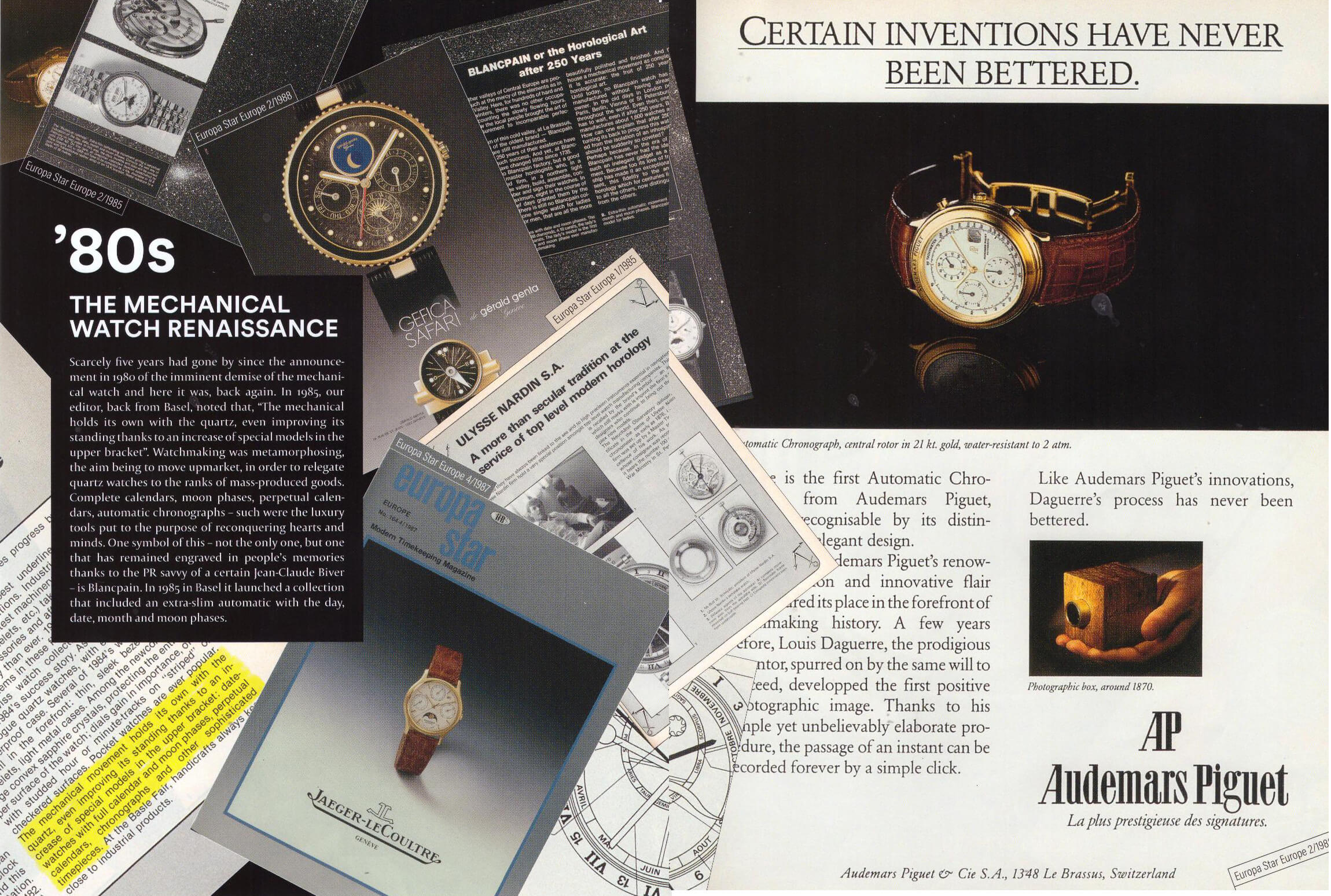 Jednym, ale nie jedynym z symboli tego okresu, który został wyryty we wspomnieniach ludzi dzięki znajomości zależności PR i pewności siebie był Jean-Claude Biver i firma Blancpain. W 1985 roku w Bazylei marka ta wprowadziła kolekcję, która zawierała wyrafinowany zegarek z automatycznym naciągiem posiadającym wskazania: dnia tygodnia, datę, nazwy miesiąca i faz księżyca.