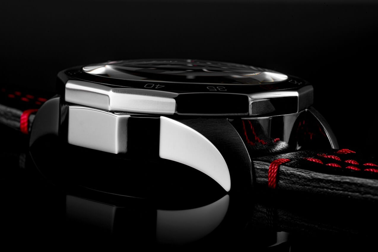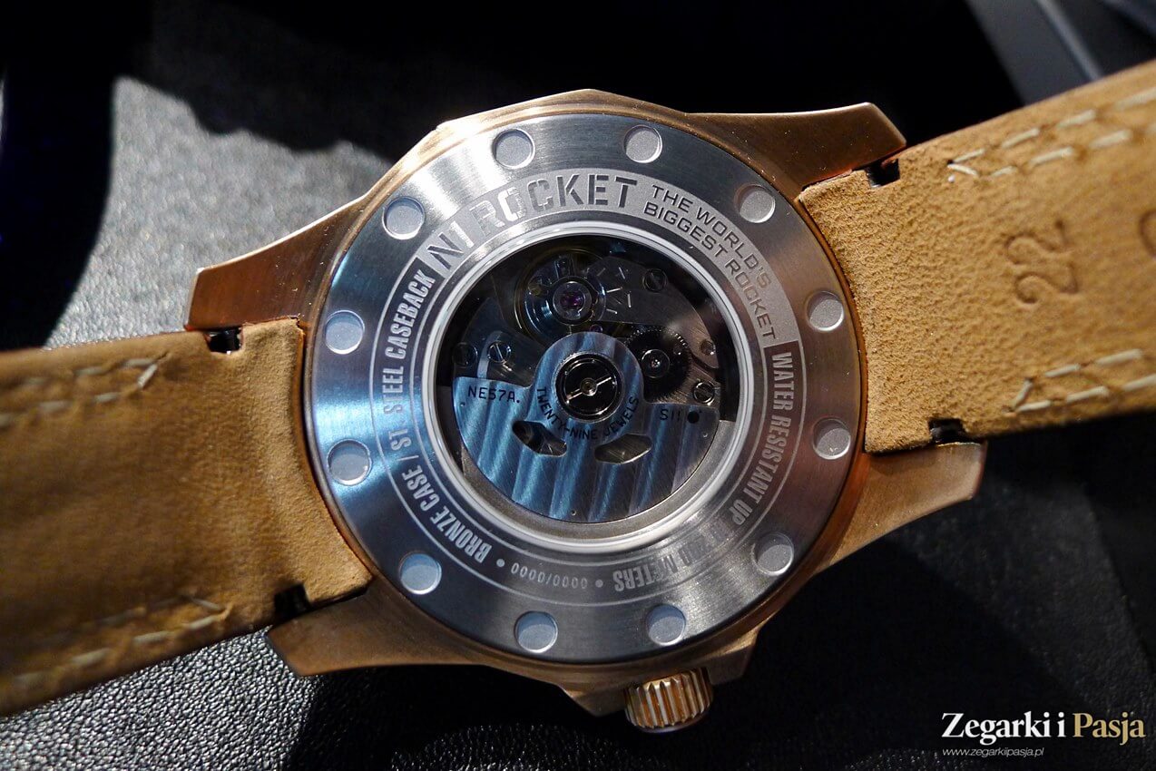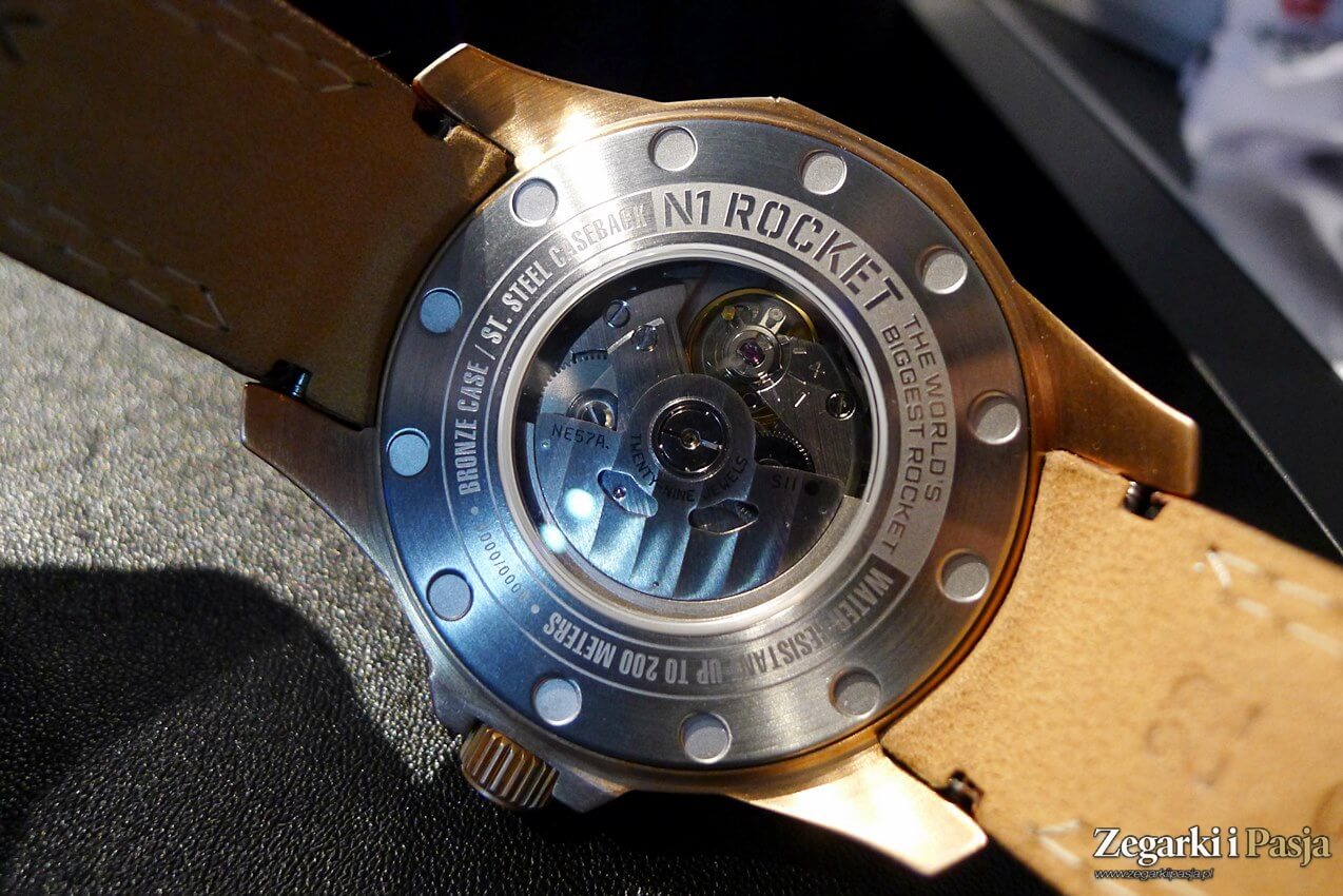 Po prawej stronie obudowy wyprowadzono wypustki chroniące sporą i wygodną w obsłudze koronkę. Przykręcany dekiel jest przeszklony i możemy dzięki temu obserwować „sprawcę” sporych zmian, jakie zaszły w układzie tarczy nowego modelu. Chodzi o mechanizm NE57 firmy Seiko Instruments Inc. wyposażony w komplikację konstrukcji, którą zawsze opisuję jako jedną z najbardziej użytecznych, czyli wskazanie rezerwy chodu.