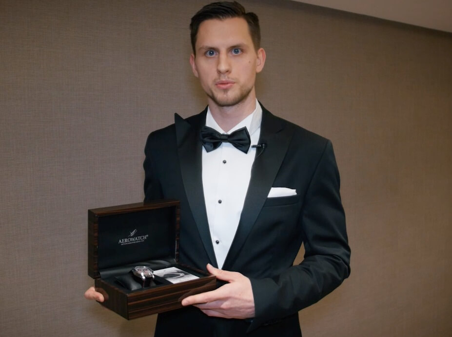 Podczas gali koszykarze prezentowali swoje limitowane zegarki Aerowatch Renaissance Polish BAsketBall 52pcs, a prezes PZKosz ozdobił swój nadgarstek modelem Aerowatch Renaussance Big Mechanical Skeleton 50981 RO01.