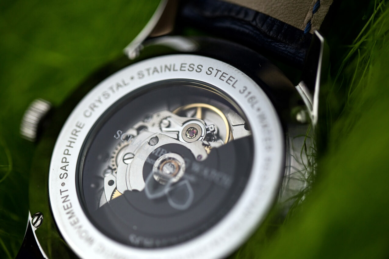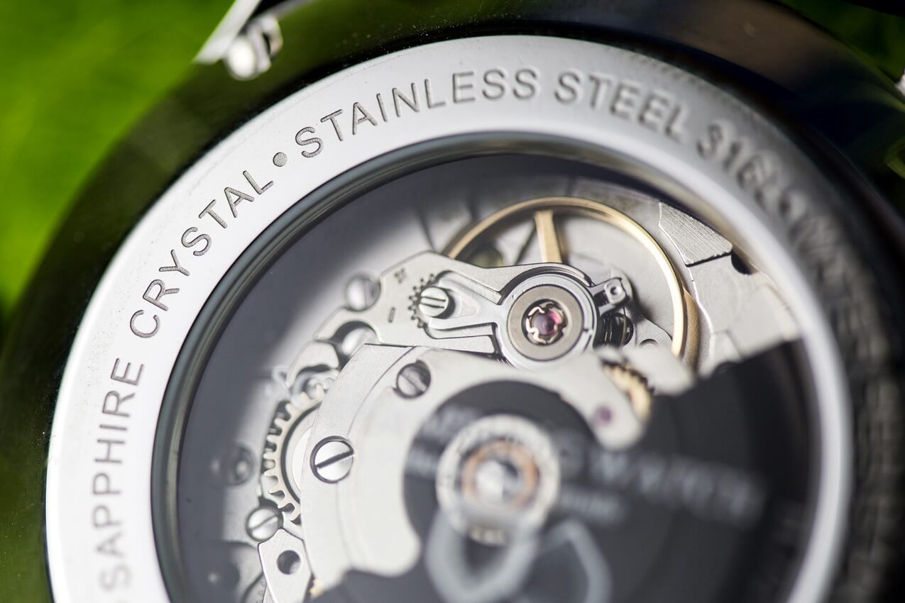 Dekiel jest stalowy, przykręcany czterema śrubkami, a w centralnej części ma przeszklenie, przez które widzimy mechanizm SW-20A z czarnym wahnikiem.