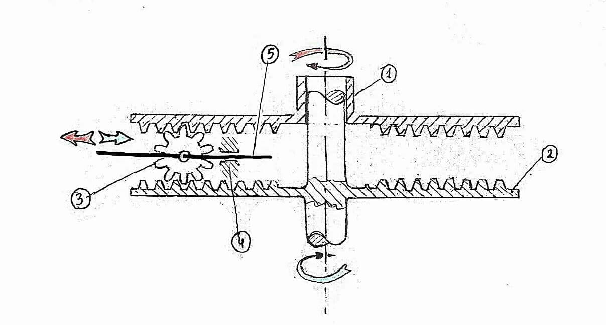 Jeśli obrót np. tarczy nr 1 powoduje przesuwanie jarzma w lewo, to obracając tarczą 2 w tym samym kierunku, spowodujemy ruch jarzma w prawo, czyli powrót do wcześniejszego położenia.