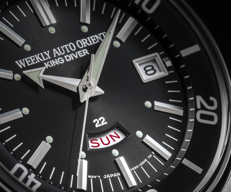 Nieco pod centralną częścią tarczy, nad godziną szóstą, wycięte zostało małe, łukowate okienko, w którym możemy odczytać dzień tygodnia. Nie zobaczymy tu natomiast klasycznego logo marki Orient, jakie znamy z innych jej modeli. Na koronkach zastosowano literę „O” ze starego logo marki. To, co widzimy na tarczy pod godziną dwunastą, to nadrukowana nazwa modelu wykonana dokładnie tak, jak na cyferblacie zegarka z 1965 roku, czyli „WEEKLY AUTO ORIENT KING DIVER”.