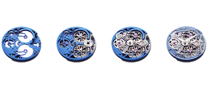 Piękno tego niezwykłego mechanizmu tkwi w tym, że niepotrzebne fragmenty płyty głównej zostały wycięte – oczywiście nie naruszając przy tym stabilności/sztywności konstrukcji. Następnie owa płyta została pokryta niebieską powłoką, którą producent nazywa "3D-PVD", a wielopłaszczyznowe ułożenie części składowych mechanizmu tworzy fantastyczny efekt trójwymiarowości – wygląda to obłędnie!