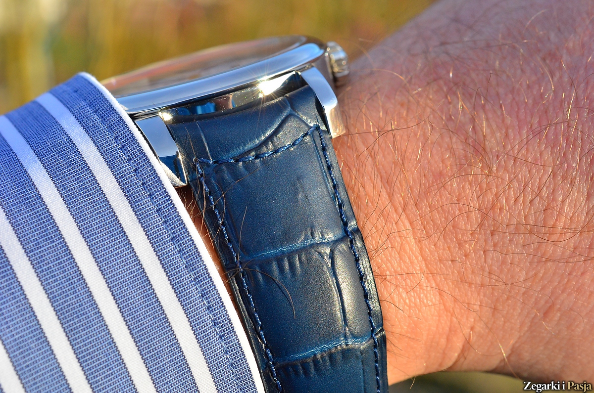 Może dużą wielkością – koperta ma 45 mm średnicy – ale powiększanie zegarków to teraz dość powszechne zjawisko. Okrągły kształt ze średniej szerokości lunetą oraz proste i prostopadle wypuszczone uszy – trochę podobnie jak w Glycine Airman – ale jednak bardziej subtelne i eleganckie.