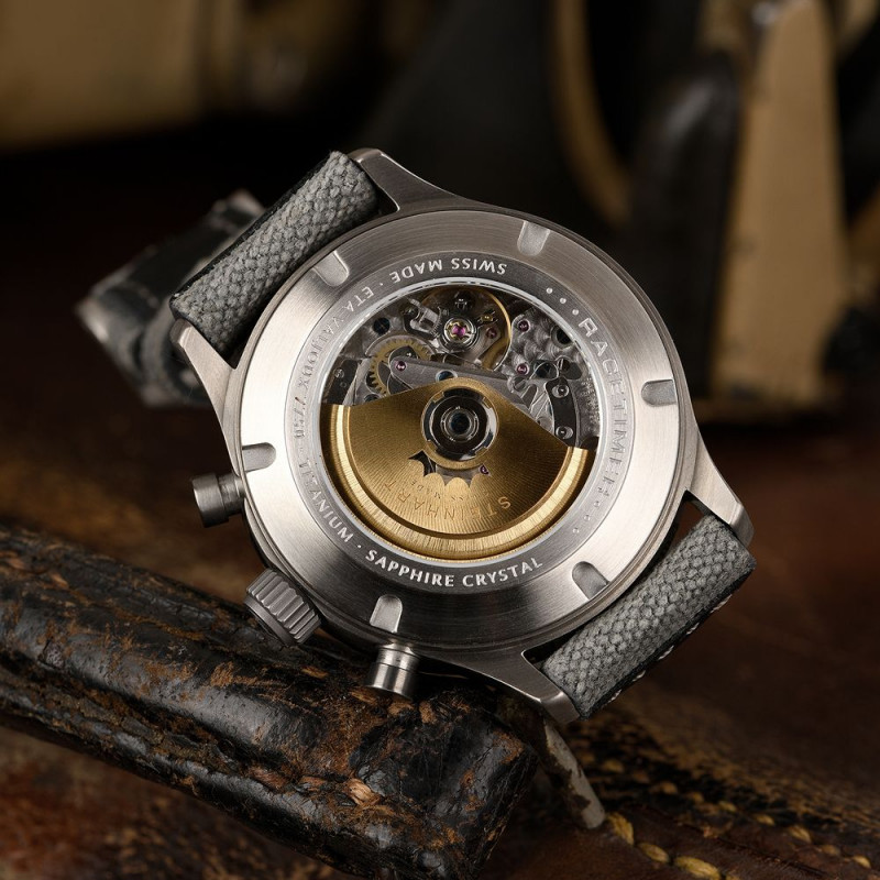 Koperta Flighttimera jest spora, lecz właśnie dzięki budulcowi nie jest ciężka. Wprawdzie rozmiar, szkło i mechanizm muszą „swoje” ważyć, jednak 105 gramów przy tej wielkości zegarka to dobry wynik. To nie jest raczej dyskretny elegant do chowania pod mankietem, tym bardziej, że grubość to również niebagatelne 16 mm.
