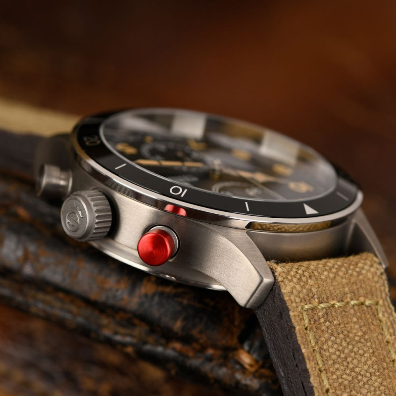 Model Vintage Military ma jeszcze jeden ciekawy smaczek. Grzybek górnego przycisku stopera jest czerwony, co stanowi ciekawy i atrakcyjny akcent na tle dość stonowanej tarczy.