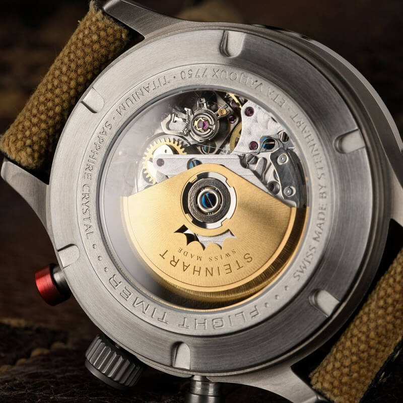 Marka Steinhart zastosowała własny wzór rotora w złocistym kolorze z wygrawerowaną nazwą firmy i wyciętą koroną Steinharta. Poniżej możemy jeszcze podziwiać powierzchnie pokryte pasami genewskimi jak i perełkowane. Widoczne śrubki mają główki zabarwione na niebiesko.