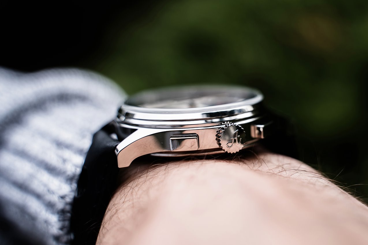 Gładko wypuszczone uszy doskonale komponują się z ogólnym wizerunkiem zegarka i nie zaburzają harmonii jego formy. Koronka zlokalizowana na godzinie 3 jest nieco niższa od standardowych, dzięki czemu, nawet przy skrajnych ruchach nadgarstka nie będzie opierała się o śródręcze, co znacząco podnosi komfort noszenia zegarka.