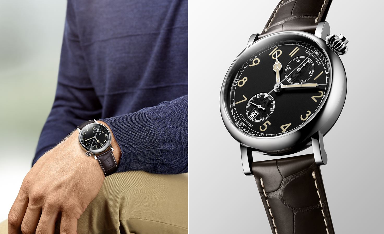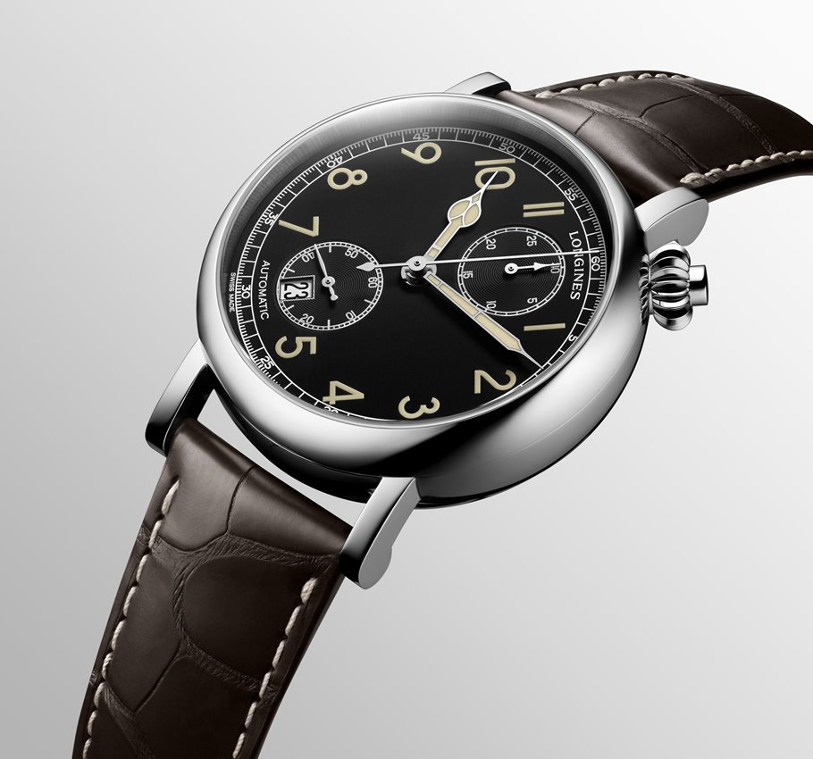 Nowy Longines Avigation Watch Type A-7 1935 to udany czasomierz w stylu retro. Bardzo uniwersalny pod względem rozmiaru koperty, a jednocześnie mający szereg unikalnych i wyróżniających go cech, jak obsługa stopera jednym przyciskiem, czy nietypowo ustawiona tarcza.