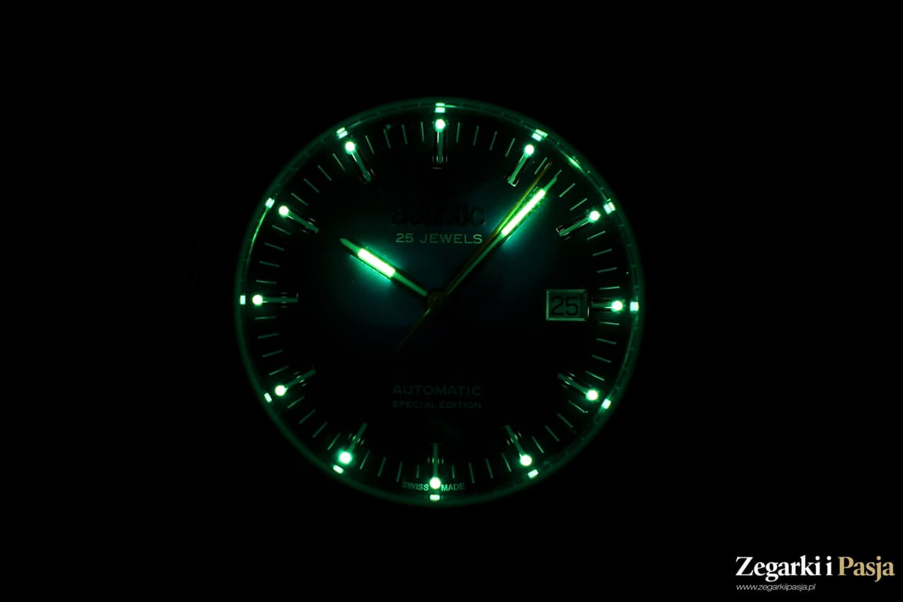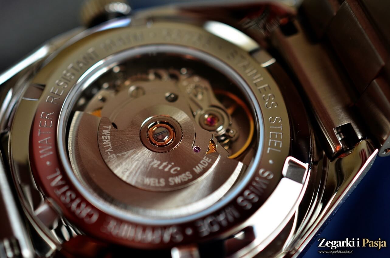 Zastosowanie tego mechanizmu zapewnia właściwą precyzję pracy zegarka. Mechanizm pracuje z częstotliwością 28 800 wahnięć koła balansowego na godzinę, łożyskowany jest na 25 kamieniach i zapewnia co najmniej 38 godzin rezerwy chodu. Niestety, mechanizm jest wykończony na poziomie podstawowym. Na wahniku pokrytym szlifem słonecznym wygrawerowano nazwę firmy. Poza tym widzimy raczej surowe elementy mechanizmu. Stosując przeszklenie warto zaprezentować choć odrobinę więcej.