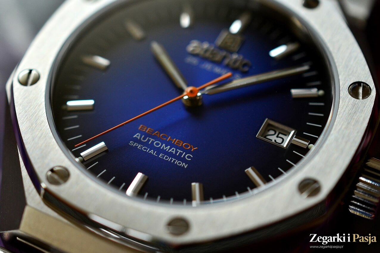 Zastosowane wskazówki są proste, polerowane i mają kształt w stylu „pen”, z ostrym zakończeniem. Poprzez ich środkową część, wzdłuż, również na wzór indeksów, poprowadzone są paski w tym wypadku pokryte masą luminescencyjną. Tak dobrane wskazówki pasują do całości projektu, a pomarańczowy, wąski sekundnik stanowi kontrastowy element i koresponduje z napisem Beachboy na tarczy. Napisem nadrukowanym farbą także w pomarańczowym odcieniu, pod osią wskazówek. Pod godziną 12 znajduje się nakładane, polerowane logo i również w formie nakładanej nazwa firmy, a na godzinie 3 umieszczono okienko datownika. Tarczę, jak wspomniałem przy okazji opisywania koperty, chroni szkło szafirowe z powłoką redukującą refleksy światła. Wersja limitowana, gradientowa, ma delikatny szlif słoneczny, a pozostałe wersje cyferblatu są pionowo szczotkowane.